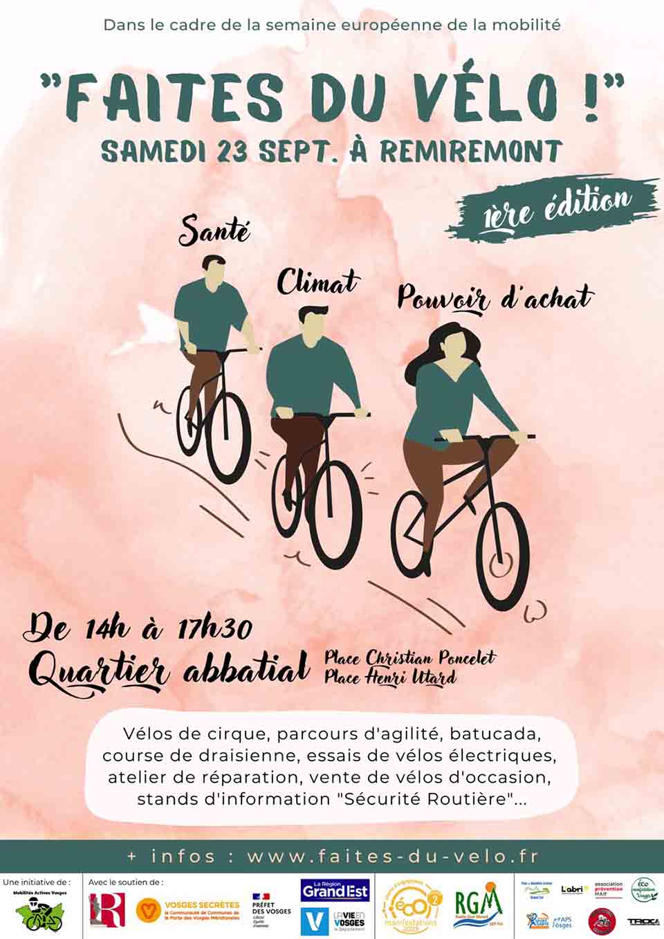 L’association Mobilités Actives Vosges organise le samedi 23 septembre à Remiremont la 1ère édition de la « Faites du vélo ! » au cœur du quartier abbatial.