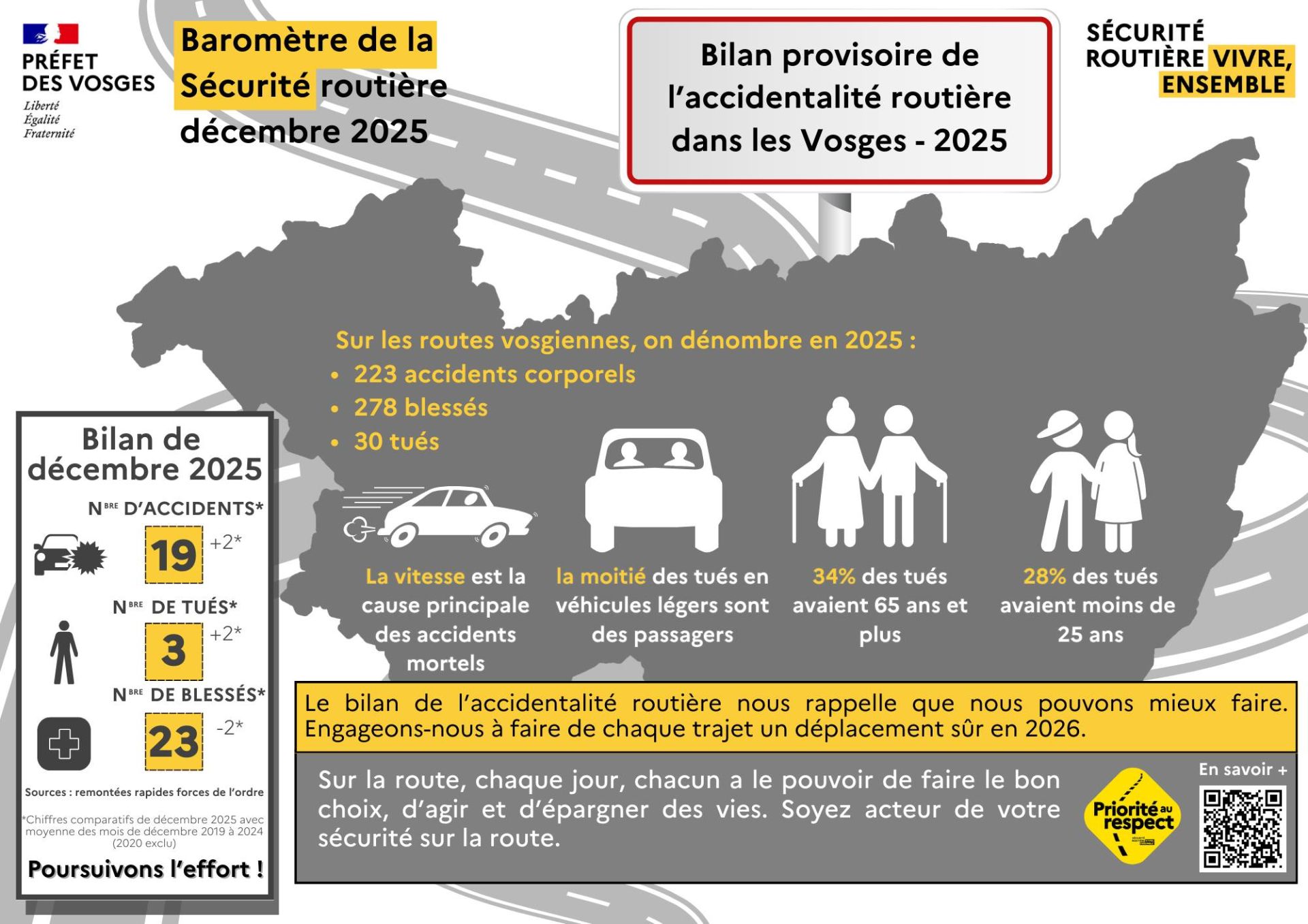 Les opérations de secours, de relevage, et d'enlèvement des véhicules ont nécessité de lourds moyens et se sont terminées tard dans la soirée. C'est le premier décès sur la route dans le département depuis le début de l'année 2026. 2025 fait état d'un bilan de trente morts et de 278 blessés.