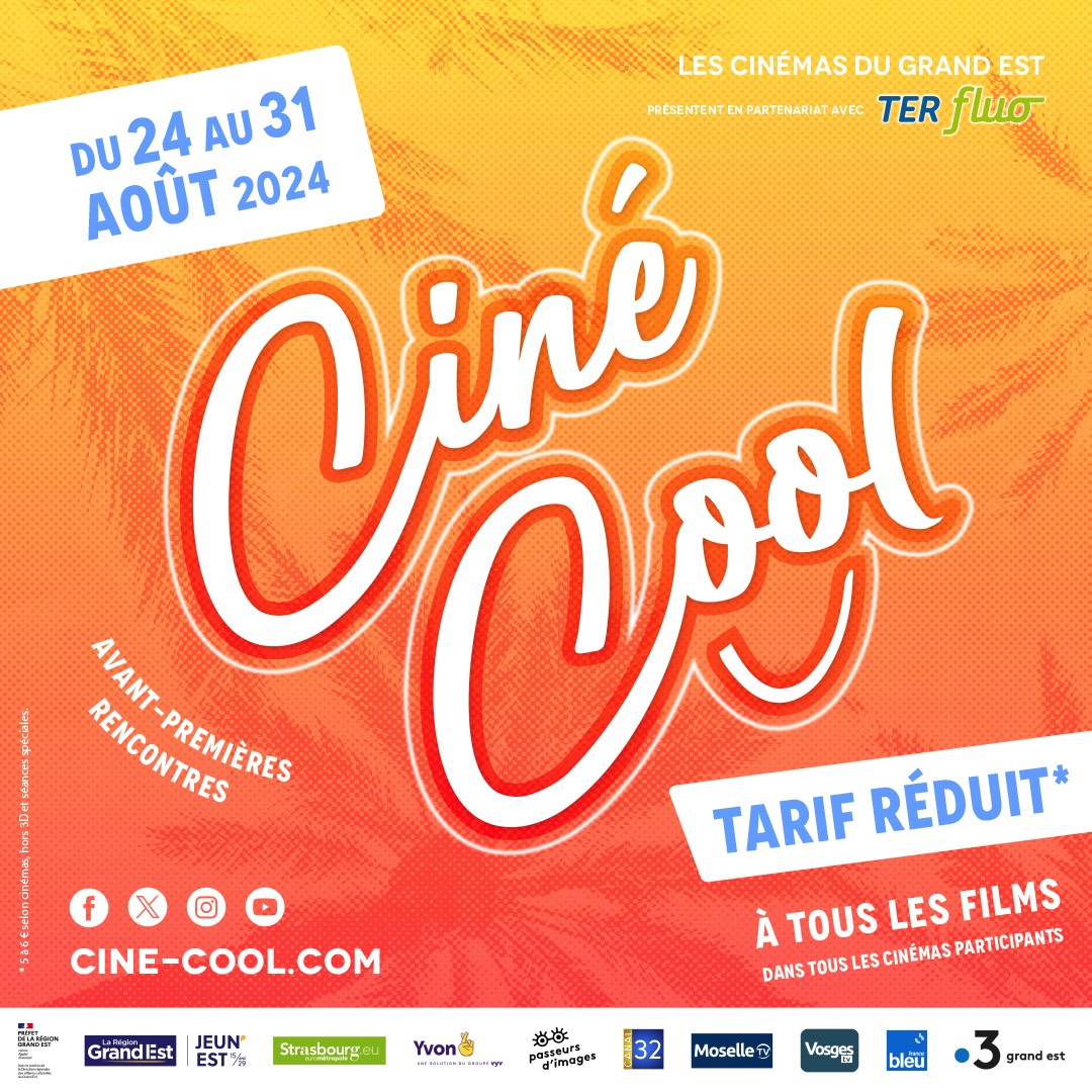 Pour cette 27e édition, le tarif préférentiel proposé sera fixé par chaque cinéma participant dans une fourchette allant de 5€ à 6€ la séance (hors majoration 3D éventuelle) ; un prix inférieur de près de 30% au prix moyen habituel. Il donnera accès à un film en sortie régulière ou comptant parmi la quarantaine de longs métrages projetés en avant-premières dans le cadre de Ciné-Cool. Ces dernières concernent des productions majoritairement françaises, mais aussi internationales, allant de l’œuvre Art & Essai au blockbuster et donnant lieu à des rencontres publiques avec les équipes de films (une cinquantaine de rencontres se sont tenues en 2023). L’opération Ciné-Cool est portée par le Syndicat des directeurs de cinémas de l’Est, le Syndicat des directeurs de cinémas Rhin & Moselle et l’Association des cinémas indépendants de l’Est. Ces organisations professionnelles représentent l’ensemble des salles du Grand Est, quels que soient leur taille, statut ou zone d’implantation, qu’il s’agisse de la grande exploitation (plus de 450 000 entrées annuelles : circuits nationaux tels que UGC, Gaumont, Pathé, CGR, etc.), de la moyenne exploitation (entre 80 000 et 450 000 entrées) ou de la petite exploitation (moins de 80 000 entrées).