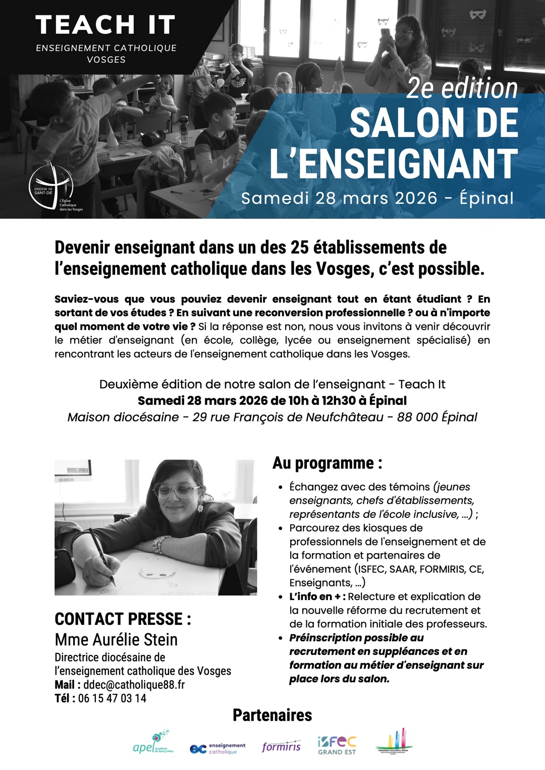 Le salon se tiendra à la Maison diocésaine, 29 rue François de Neufchâteau à Épinal. Le contact presse est assuré par Mme Aurélie Stein, directrice diocésaine de l’enseignement catholique des Vosges.