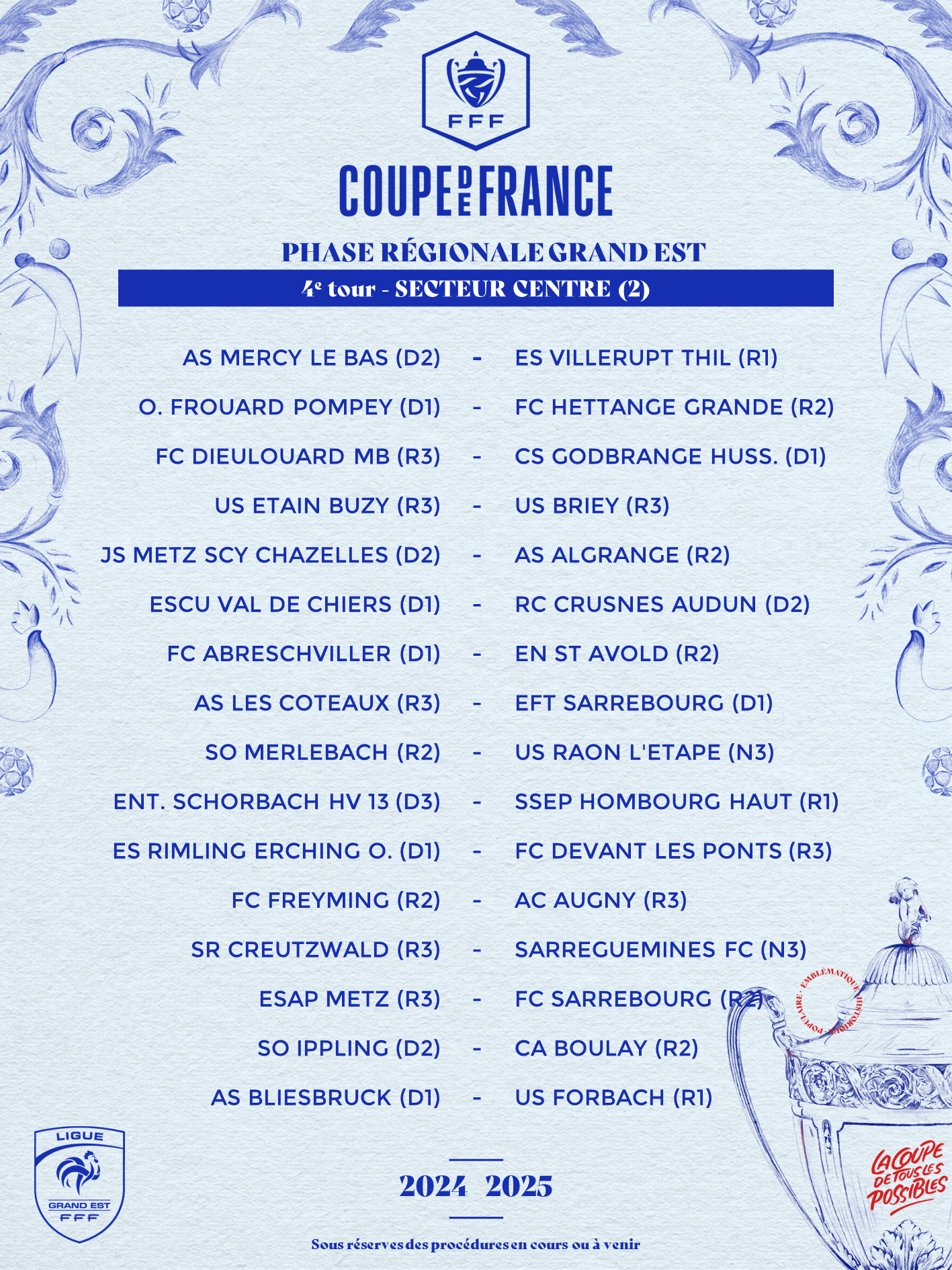 Le SR Saint-Dié Kellermann (R2) se déplacera à Ludres (R3), le FC Neufchâteau Liffol (R3) à Blanville-Damelevières (R3) et le Bulgnéville Contrex Vittel FC (R3) à l'AS ART Bosserville Lenoncourt (D3).