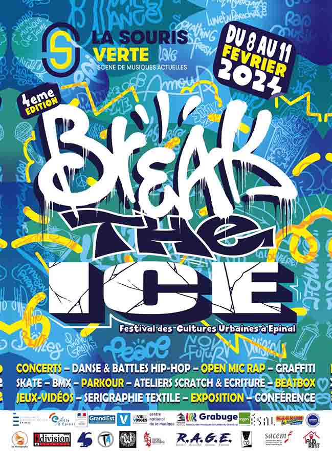Du 8 au 11 février 2024, la Souris Verte organise la 4ème édition de break The Ice avec près d’une dizaine d’acteurs locaux œuvrant dans le champ des cultures urbaines. 4 jours de festival et un ancrage territorial plus fort avec une phase en amont du festival comprenant des actions culturelles sur le territoire de l’agglomération avec différents types de public (scolaires, centre sociaux, tout public), et des temps de formation.