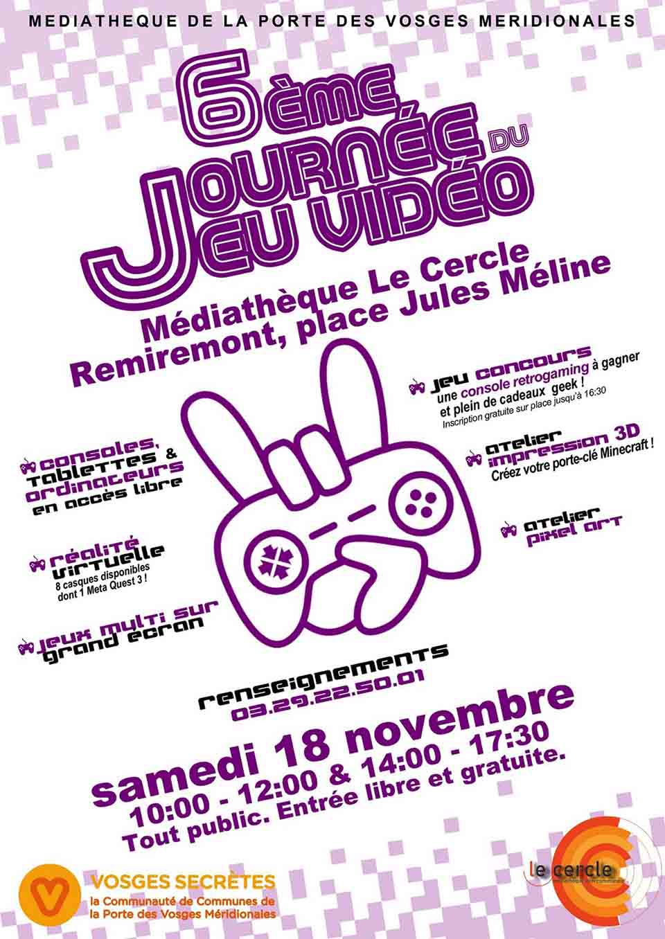 La médiathèque intercommunale Le Cercle propose une journée exceptionnelle entièrement dédiée au jeu vidéo. L’édition 2023 se déroulera samedi 18 novembre à la médiathèque de Remiremont de 10h00 à 12h00, puis de 13h30 à 17h30.