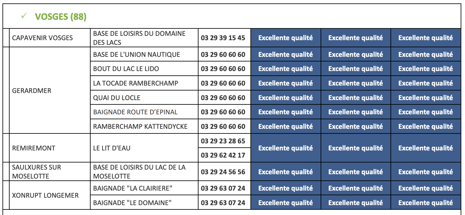 Qualité des eaux de baignade dans les Vosges : le classement des sites