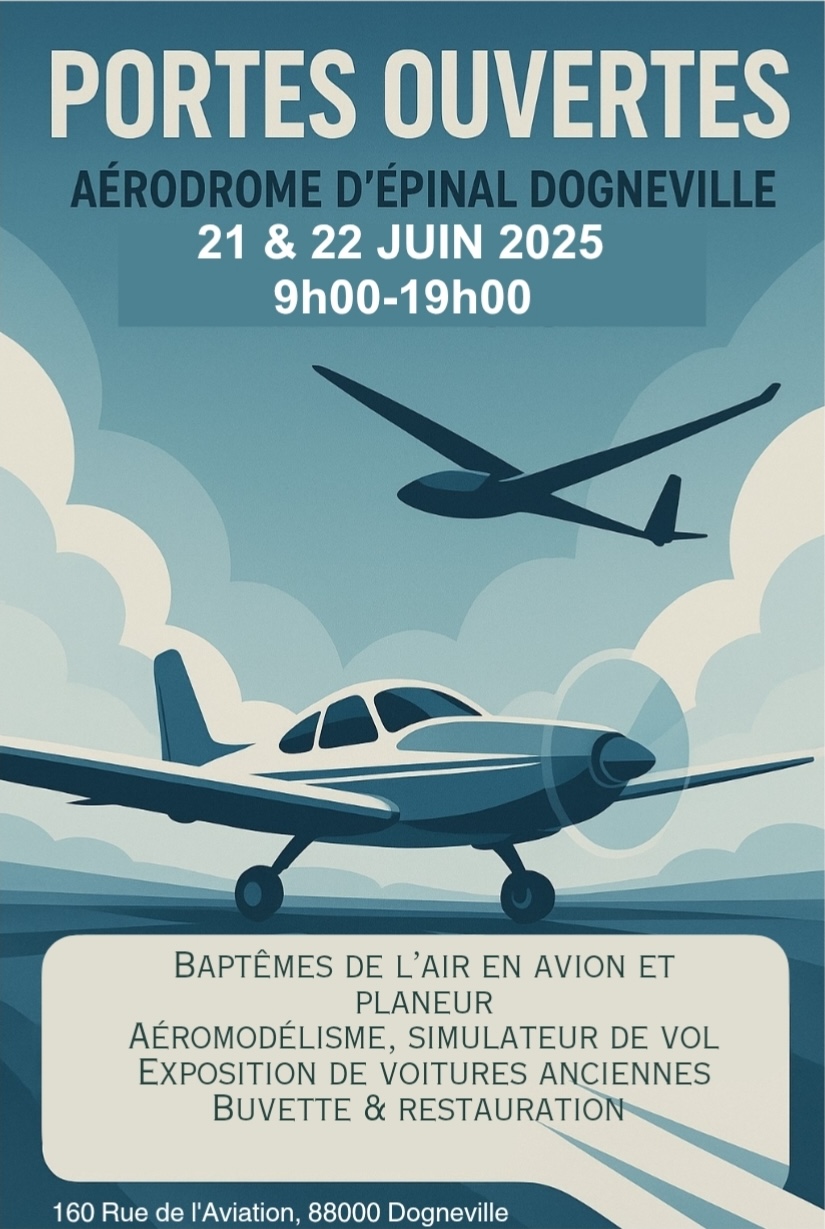 L’aérodrome d’Épinal-Dogneville vous donne rendez-vous les 21 et 22 juin pour deux jours d’animations aériennes ouvertes à tous, entre vols, découvertes et convivialité.