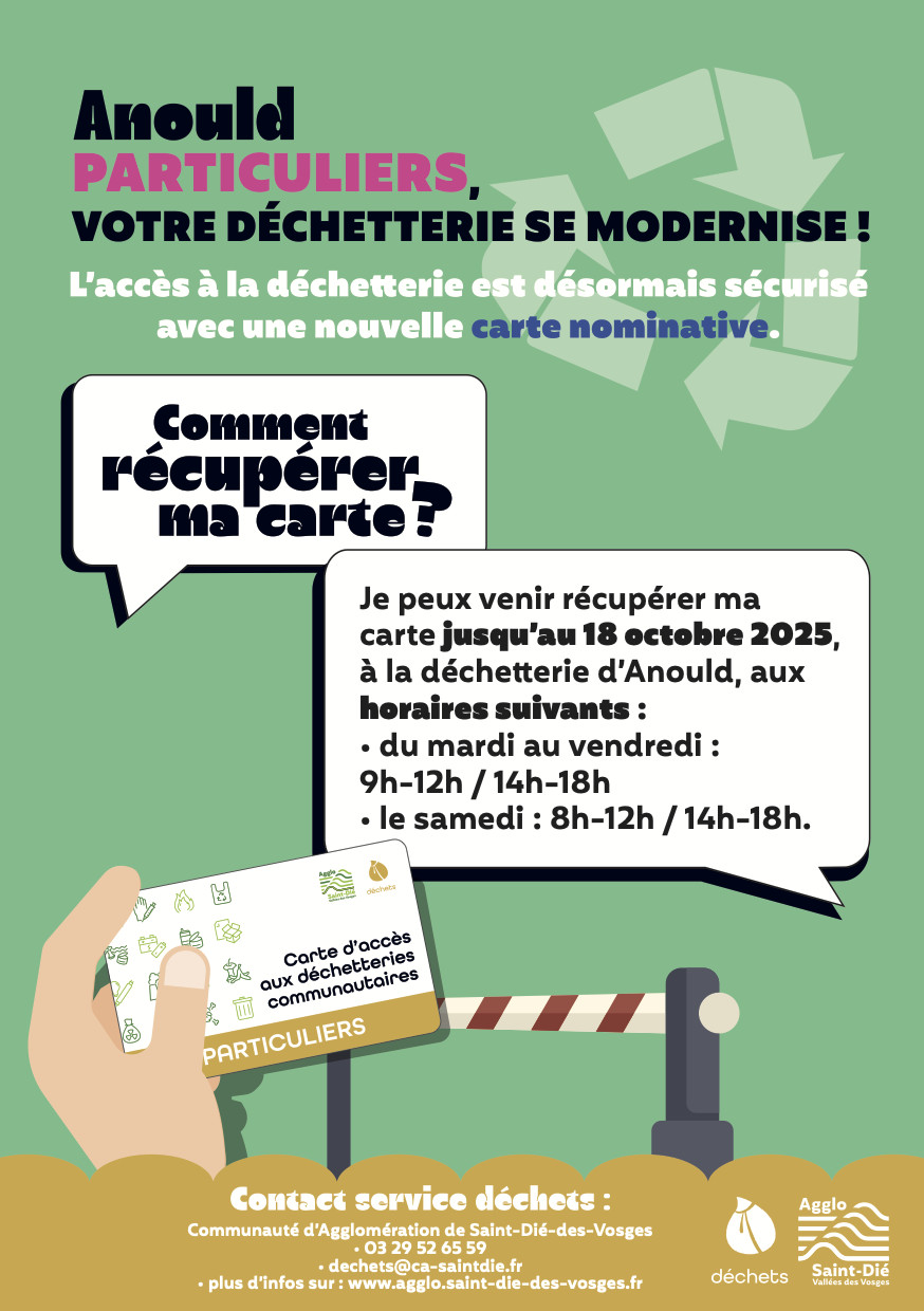 Pour accompagner cette mise en place, des permanences sont organisées directement sur le site d’Anould. Les habitants peuvent récupérer leur carte jusqu’au 18 octobre 2025, aux horaires suivants :