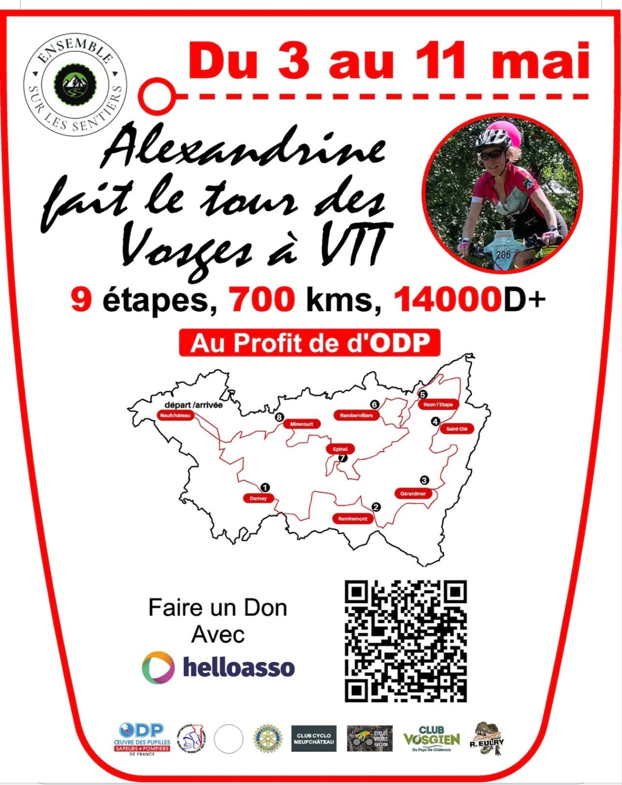 Alexandrine Pierot parcourt 700 km à VTT dans les Vosges au profit des orphelins de pompiers, soutenue par les Rotary clubs du département.
