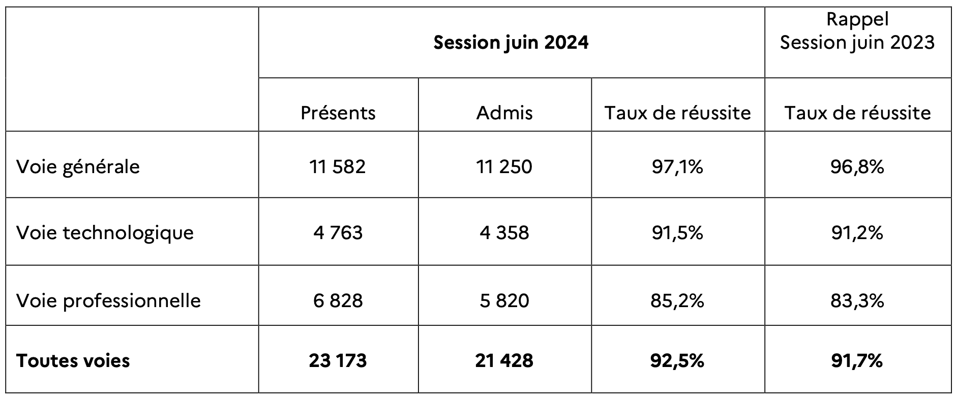 Parmi les 23 173 candidats de l’académie qui ont participé à la session de juin 2024, 21 428 ont obtenu le baccalauréat au premier ou au second groupe d’épreuves, soit 92.5% d’entre eux. Le taux de réussite global au baccalauréat est ainsi relativement en progrès par rapport à l’année précédente (0.7 point).