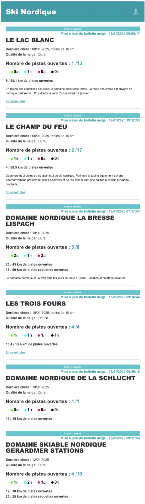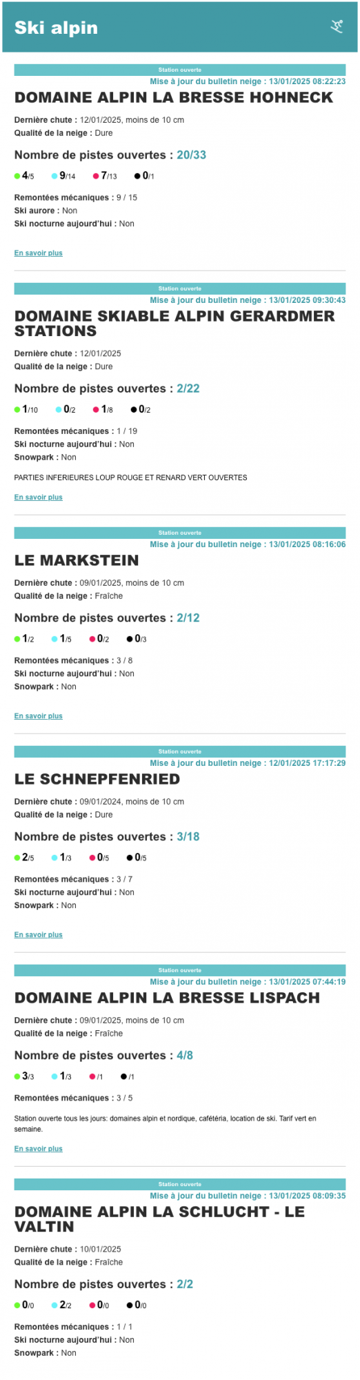 Ce bulletin d'enneigement du Massif des Vosges est élaboré à partir des informations issues des Systèmes d'Information Touristique Alsace, Lorraine et Franche-comté, fournies quotidiennement par les exploitants des stations et les Offices de Tourisme.