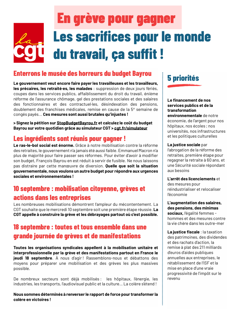 La CGT appelle à construire dès maintenant la grève dans les entreprises et à multiplier les actions de terrain. Une pétition nationale est également proposée sur StopBudgetBayrou.fr, accompagnée d’un simulateur en ligne permettant d’évaluer l’impact du budget sur le quotidien.