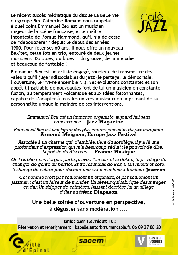 La reprise des ‘’Cafés Jazz’’, dans le cadre de la 33ème saison de l’Association Lavoir Entendu à Epinal, sera le vendredi 13 septembre au Lavoir-Théâtre Georges Brassens, avec BEX’TET, trio de très grande facture, composé d’Emmanuel Bex à l’orgue, Antonin Fresson à la guitare et Tristan Bex à la batterie.