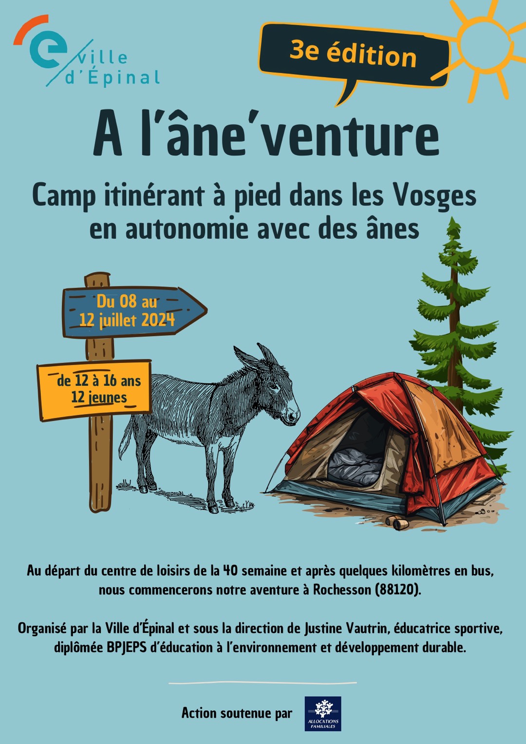Pour la troisième année consécutive, la Ville d’Épinal propose du 8 au 12 juillet prochain un "Camp itinérant dans les Vosges", en autonomie avec des ânes, pour les enfants et ados âgés de 12 à 16 ans.