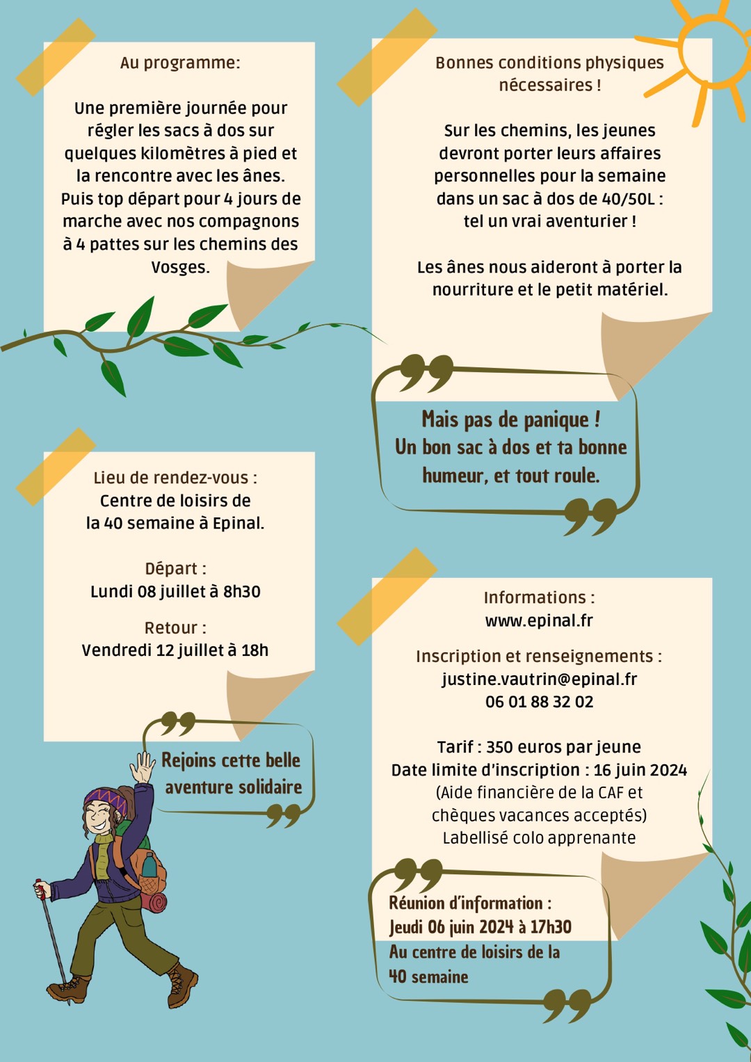 Après une journée de cohésion au centre de loisirs de la 40 semaine, et quelques kilomètres de bus, l'aventure débutera à Rochesson. Quatre jours de randonnée attendent les participants sur les chemins des Vosges en compagnie des ânes.