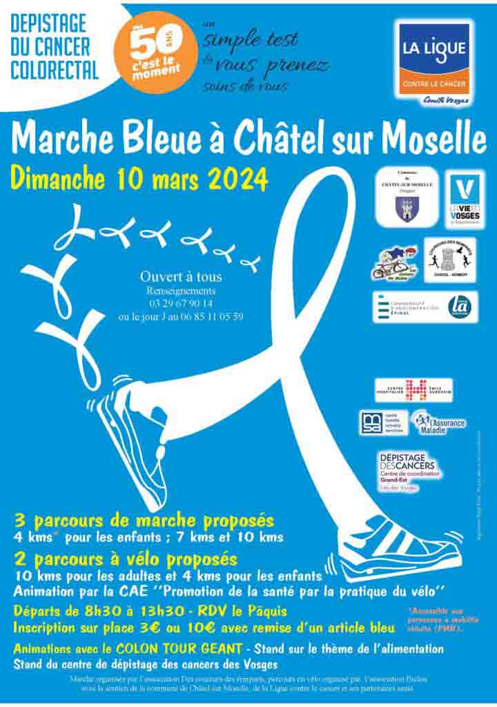 La Commune de Châtel-sur-Moselle en partenariat avec la Ligue contre le cancer et ses partenaires santé ainsi que les associations sportives locales organise une Marche Bleue le dimanche 10 mars destinée à sensibiliser sur l'importance du dépistage du cancer colorectal.