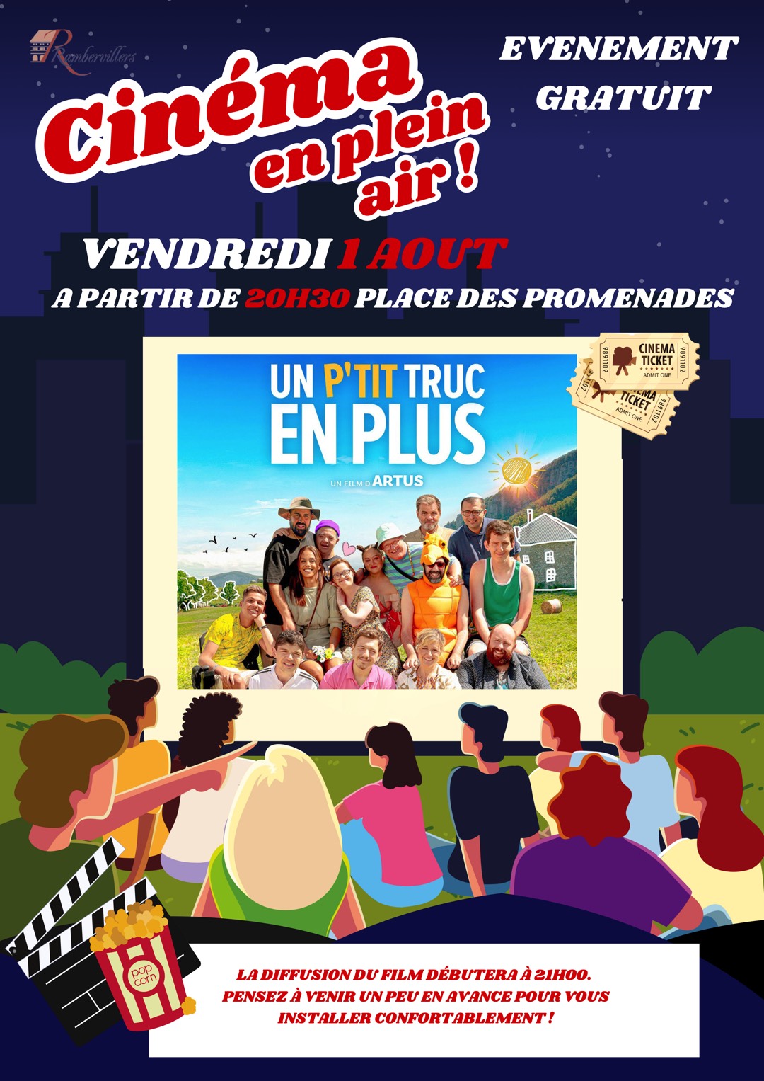Le vendredi 1er août 2025, la Ville de Rambervillers invite les habitants à une soirée cinéma gratuite en plein air sur la Place des Promenades. Au programme : la projection du film à succès Un petit truc en plus, réalisé par Artus, à la tombée de la nuit.