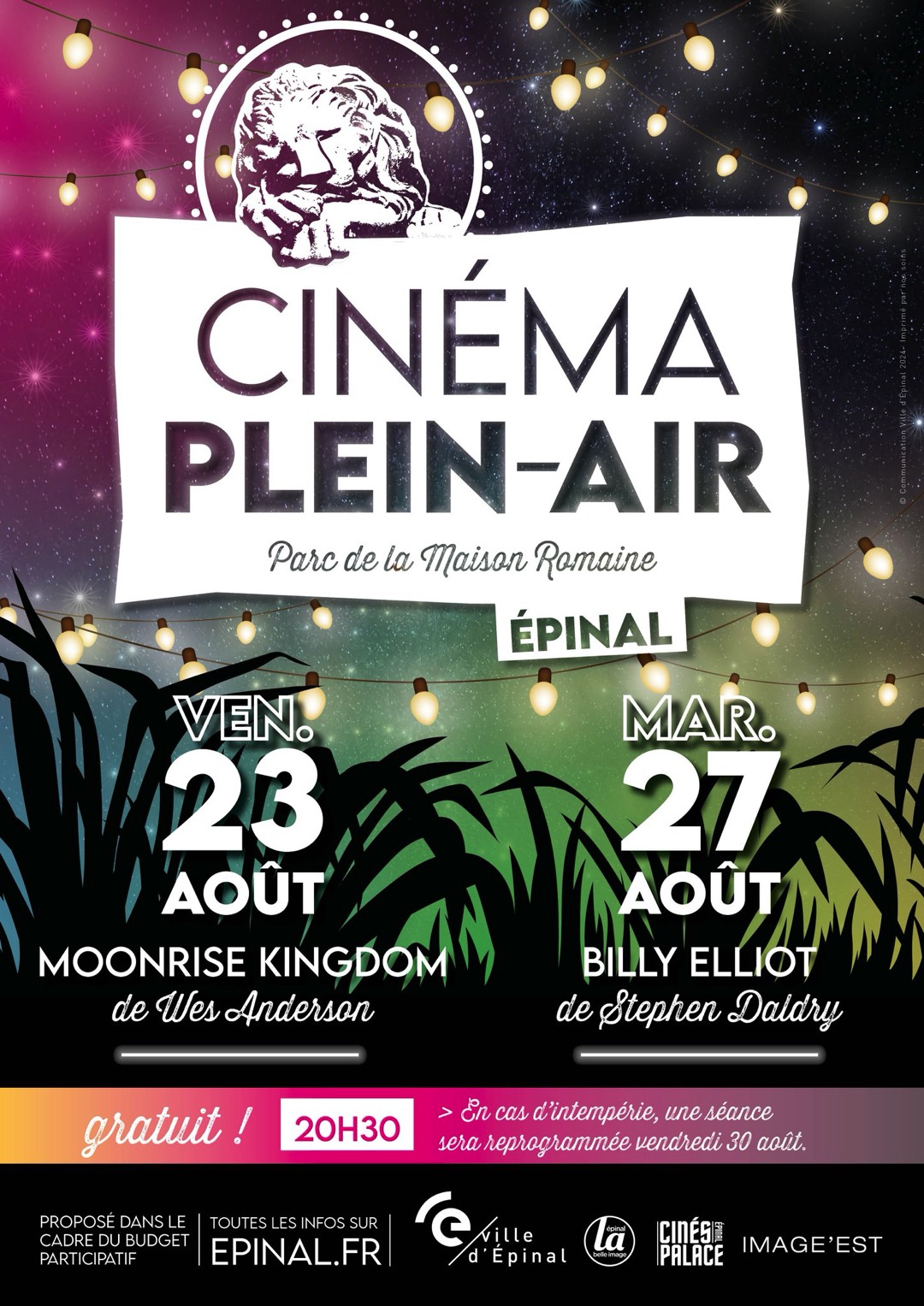 Deux séances gratuites de cinéma en plein air seront proposées dans le parc de la Maison Romaine par la Ville d’Epinal le vendredi 23 août et le mardi 27 août à 20h30. Le lieu et les films projetés (Moonrise Kingdom et Billy Elliott) ont été choisis en collaboration avec les deux habitants d’Epinal qui avaient proposé ce projet dans le cadre du budget participatif 2023-2024.