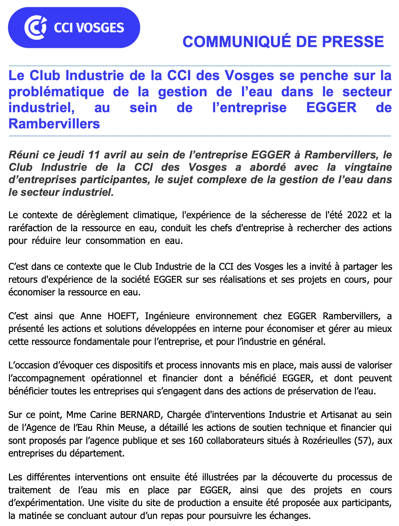 Le Club Industrie de la CCI des Vosges s’est réuni ce matin avec une vingtaine d’entreprises vosgiennes, au sein de l’entreprise EGGER à Rambervillers, autour de la thématique de la gestion de l’eau dans le secteur industriel. Voici le communiqué :
