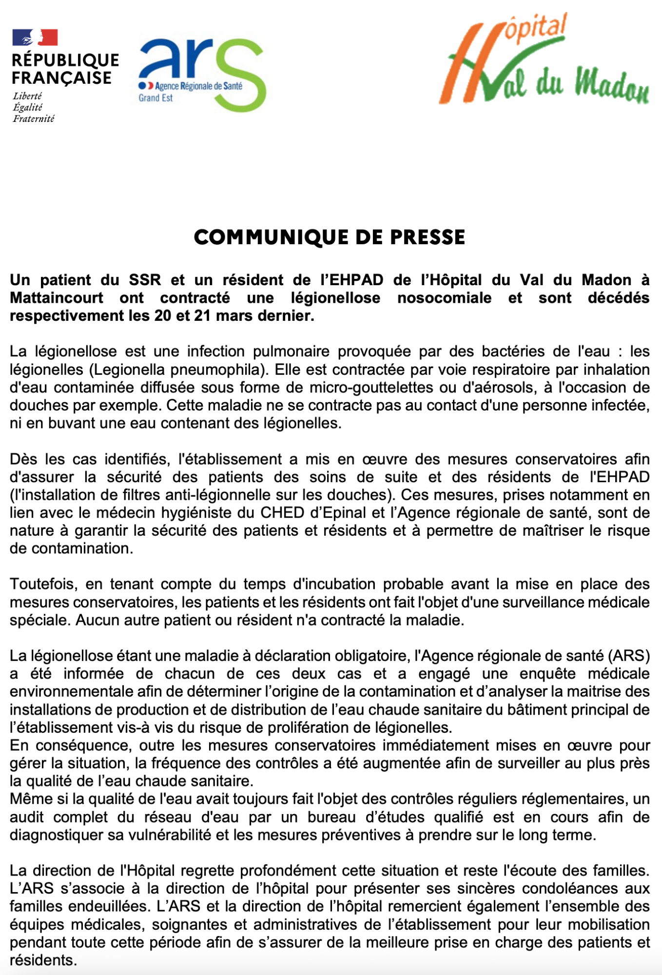 Communiqué de l'ARS et de l'Hôpital suite aux deux cas mortels de légionellose à Mattaincourt