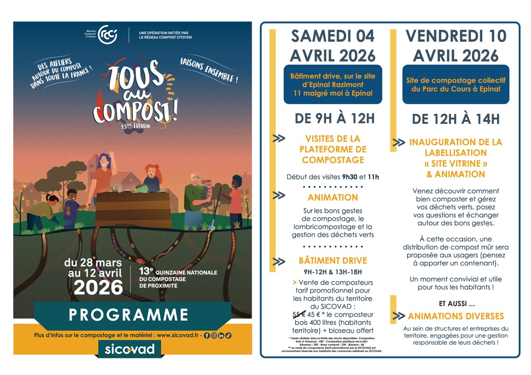 Le samedi 4 avril 2026, de 9h à 12h, le bâtiment drive du site d’Épinal Razimont accueille le public pour des visites de la plateforme de compostage. Les départs sont prévus à 9h30 et 11h.