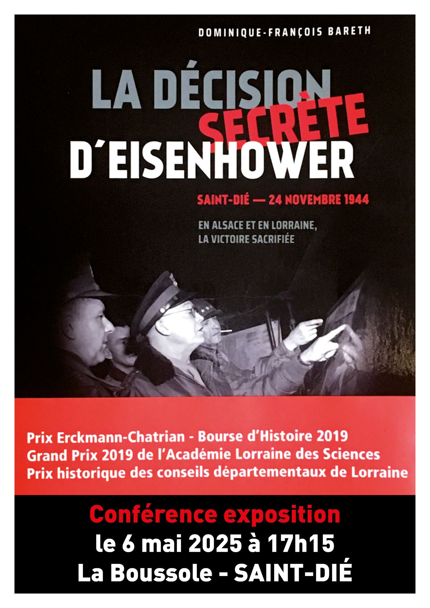 L’auteur et historien Dominique-François Bareth animera une conférence-exposition exceptionnelle autour de son ouvrage La décision secrète d’Eisenhower, le mardi 6 mai 2025 à 17h15 à La Boussole, à Saint-Dié-des-Vosges.