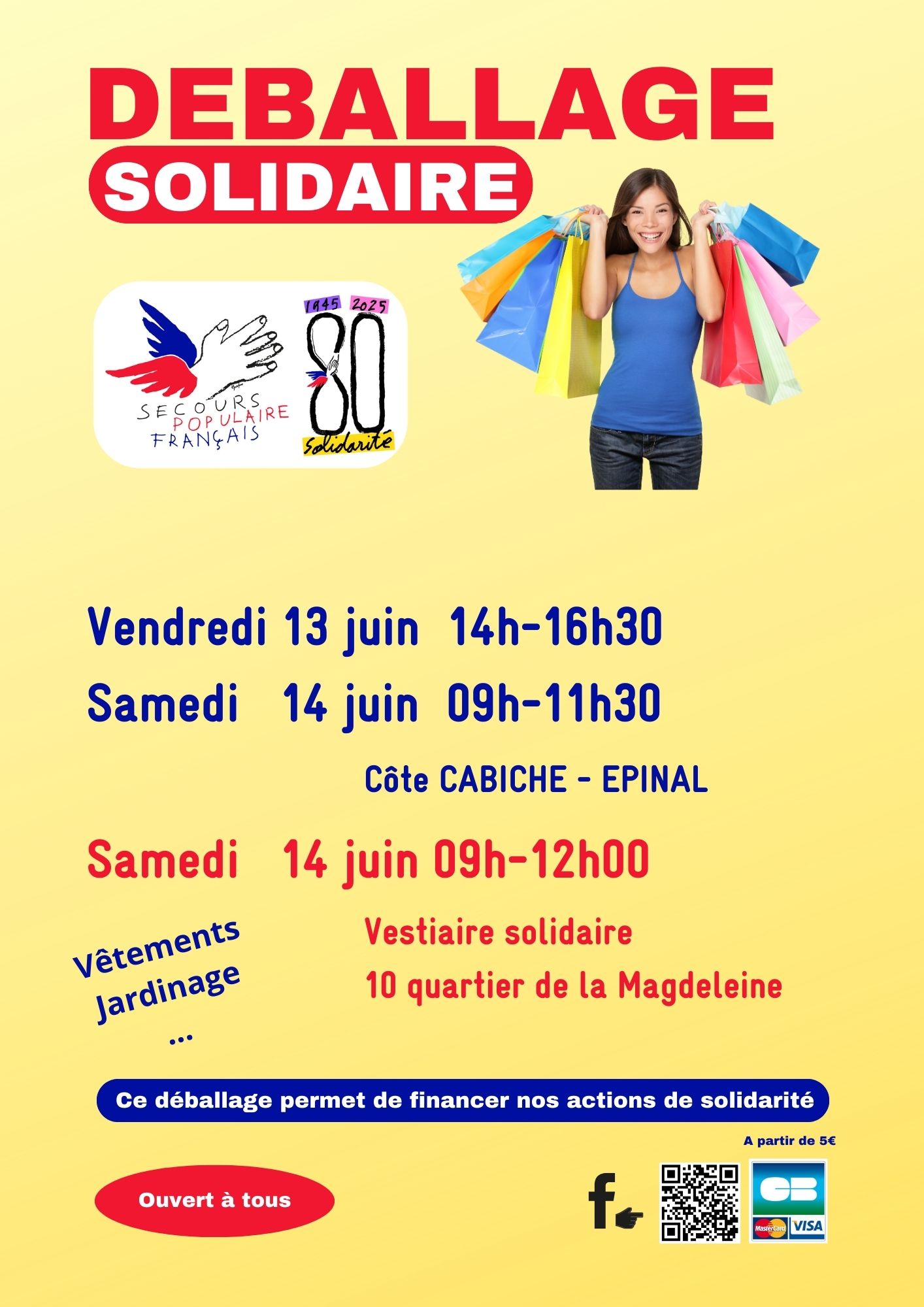 Le Secours populaire français d’Épinal organise un déballage solidaire les vendredi 13 et samedi 14 juin 2025, sur deux sites de la ville. Une initiative conviviale et solidaire destinée à soutenir les actions sociales de l'association, qui fête cette année ses 80 ans d'engagement.