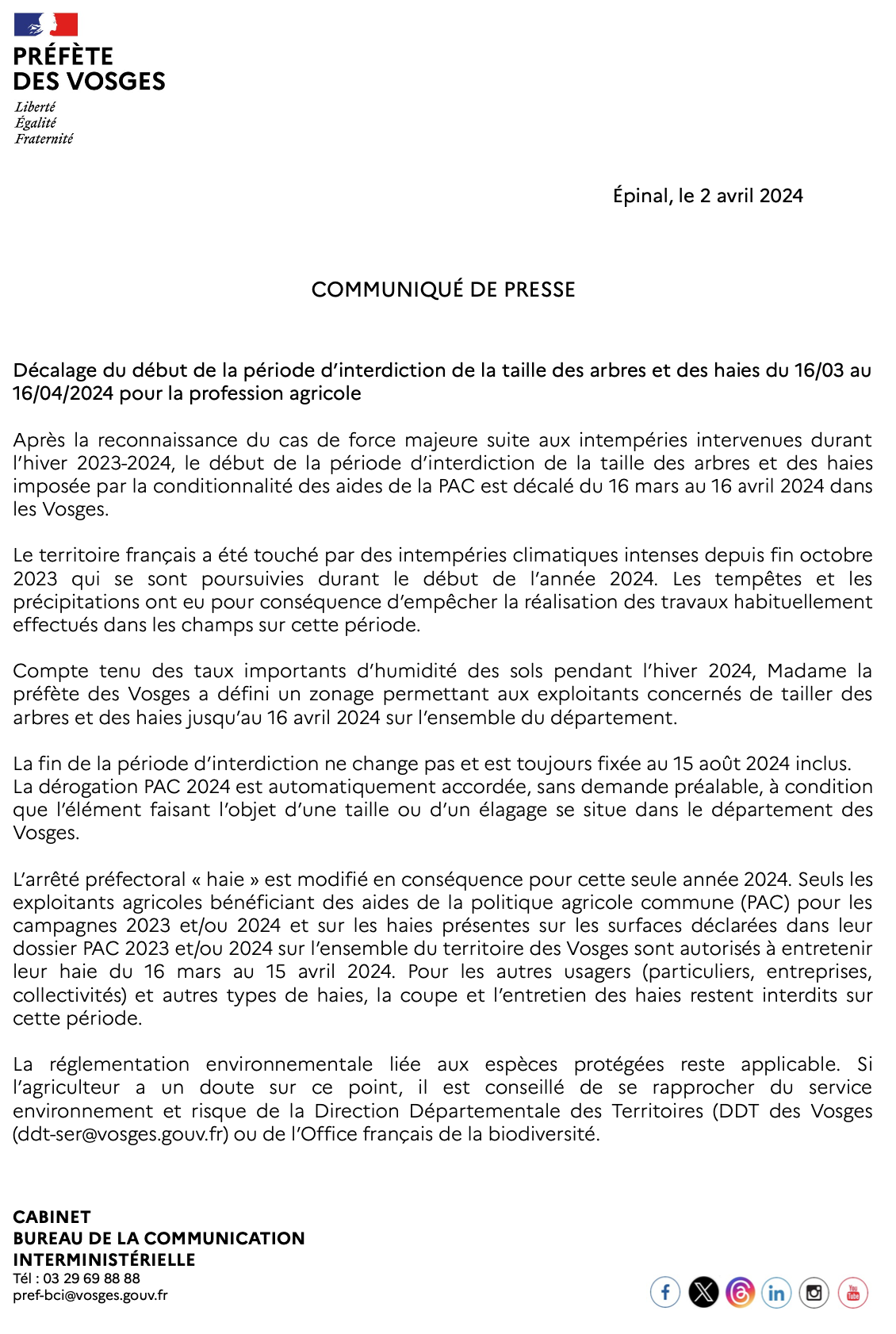 Après la reconnaissance du cas de force majeure suite aux intempéries intervenues durant l’hiver 2023-2024, le début de la période d’interdiction de la taille des arbres et des haies imposée par la conditionnalité des aides de la PAC est décalé du 16 mars au 16 avril 2024 dans les Vosges.