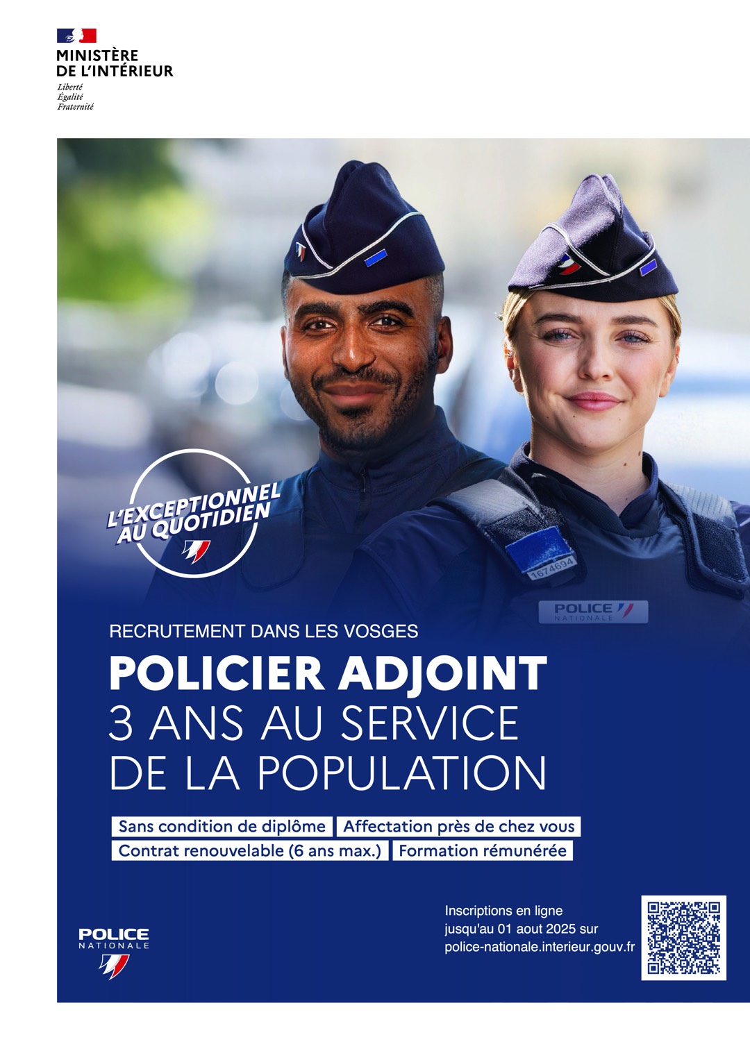 Deux concours pour intégrer la Police nationale dans les Vosges : devenez policier adjoint ou gardien de la paix. Inscriptions ouvertes jusqu’en août.