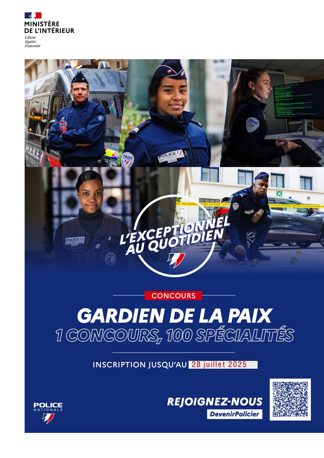 Le concours de gardien de la paix, quant à lui, est ouvert jusqu’au 28 juillet. Il s’adresse aux candidats de 17 à 45 ans titulaires au minimum d’un baccalauréat ou équivalent. Des dérogations existent pour certains profils.