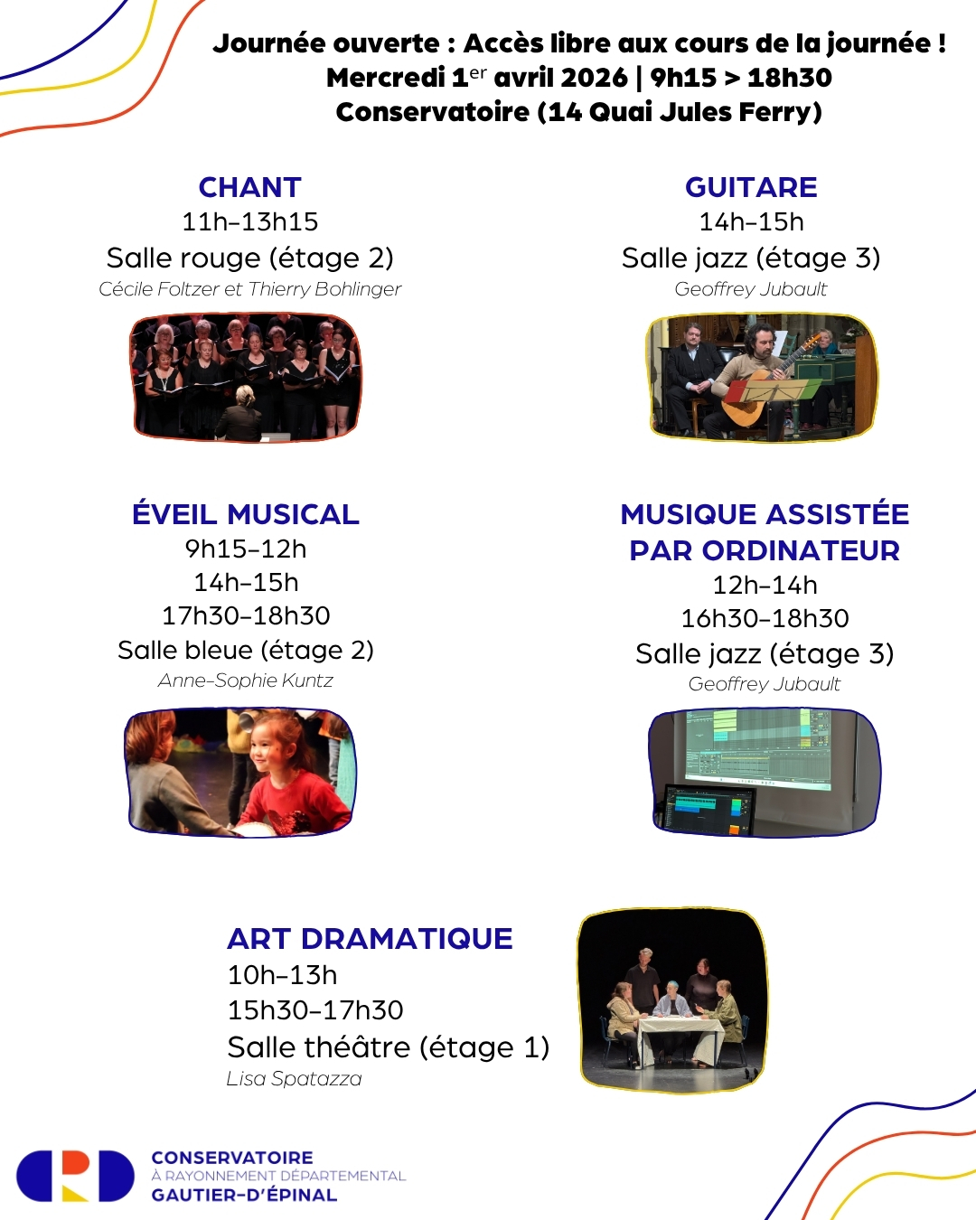 Le samedi 28 mars 2026, de 9h à 13h, le site situé 22 rue Thiers à Épinal ouvre ses portes. Le communiqué invite à « entrer dans l’univers du Conservatoire » et à découvrir « la richesse de nos enseignements, de la musique et de l’art dramatique ».