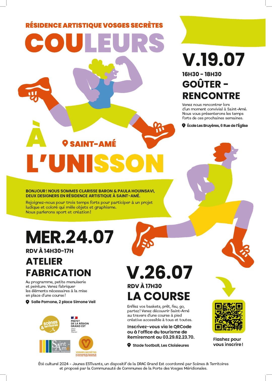 Pendant 4 semaines en juillet et août, Clarisse Baron et Paula Houinsavi, deux jeunes designers venues de Strasbourg invitées par la CCPVM, posent leurs valises et sont accueillies par la commune de Saint-Amé. Au fil de l’été, elles vont à la rencontre des habitants pour un projet autour du sport et de la création graphique. Cette résidence est ponctuée de nombreux temps d’échanges et d’ateliers créatifs :