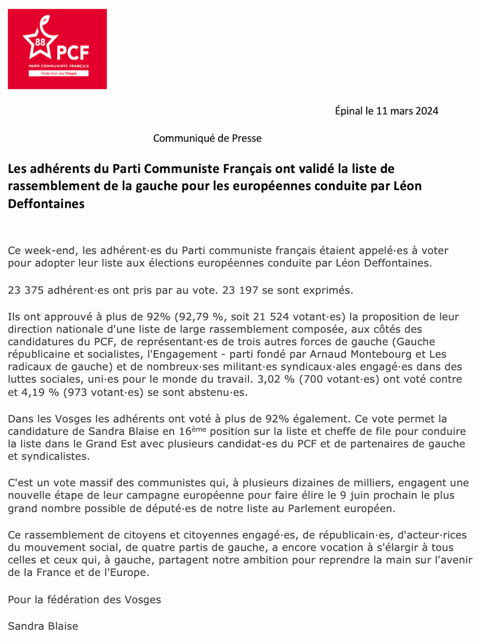 La conseillère régionale Grand Est, qui dirige le Parti communiste dans les Vosges, figure en 16ème position sur la liste portée par le jeune Léon Deffontaines. Une liste portée par le PC, qui regroupe également "l'Engagement", parti fondé par Arnaud Montebourg, la gauche Républicaine et socialiste et les Radicaux de gauche. Ci-joint le communiqué du PC vosgien :