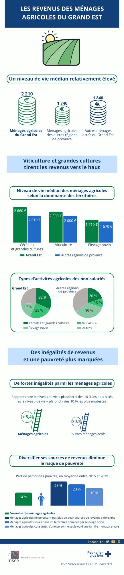 - Si le niveau de vie moyen est élevé dans le Grand Est, il existe, comme dans le reste de la France, de fortes inégalités. En moyenne, 14% des ménages agricoles du Grand Est vivent sous le seuil de pauvreté.