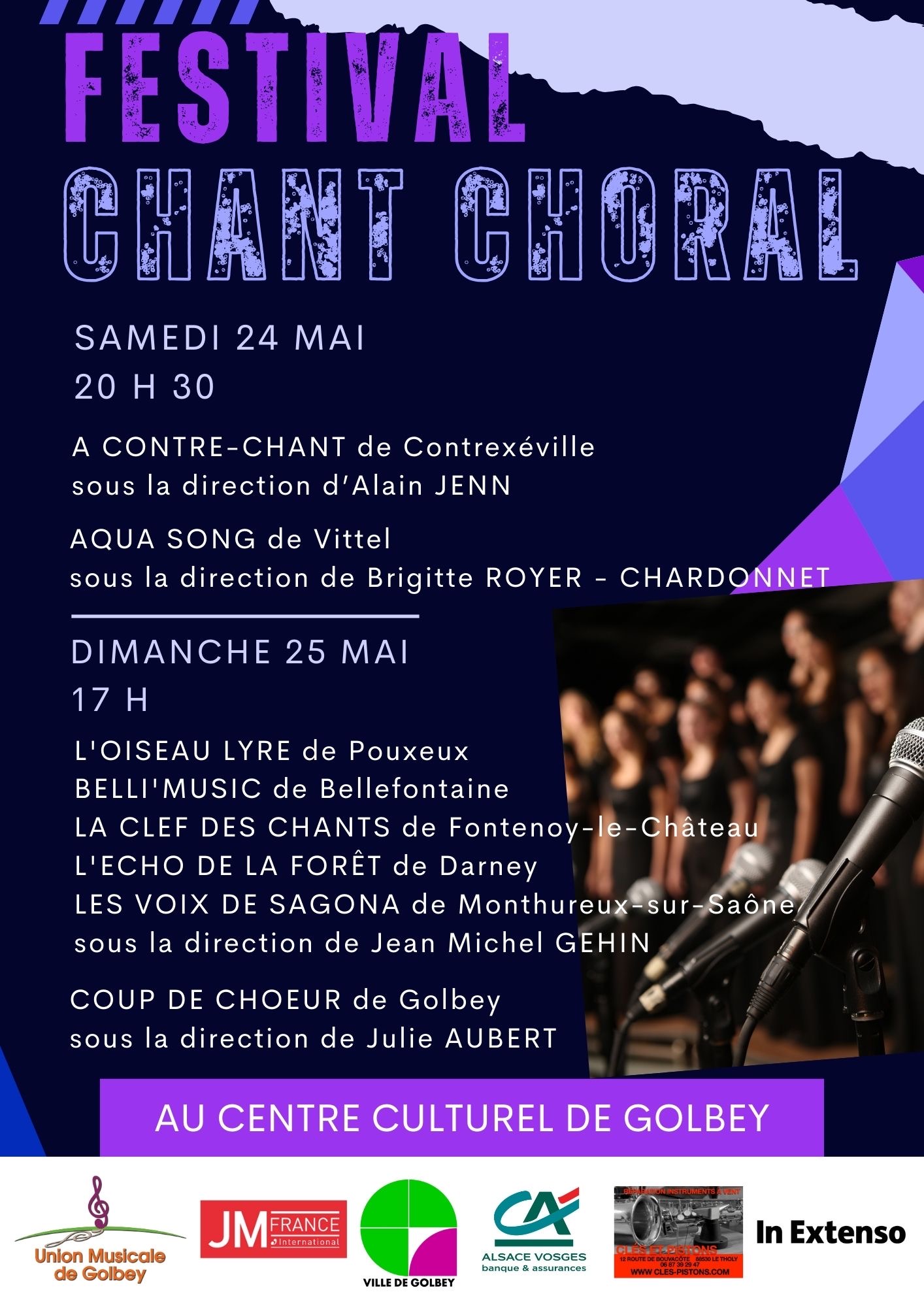 Le Centre Culturel de Golbey vibrera au rythme des voix les 24 mai à 20h30 et 25 mai à 17h, à l’occasion d’un festival exceptionnel de chant choral qui promet de belles émotions et de grands moments de partage musical.