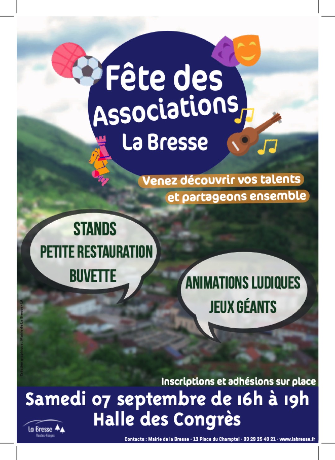 Le samedi 7 septembre 2024 aura lieu de 16h à 19h, la Fête des Associations à la Halle des Congrès de La Bresse.