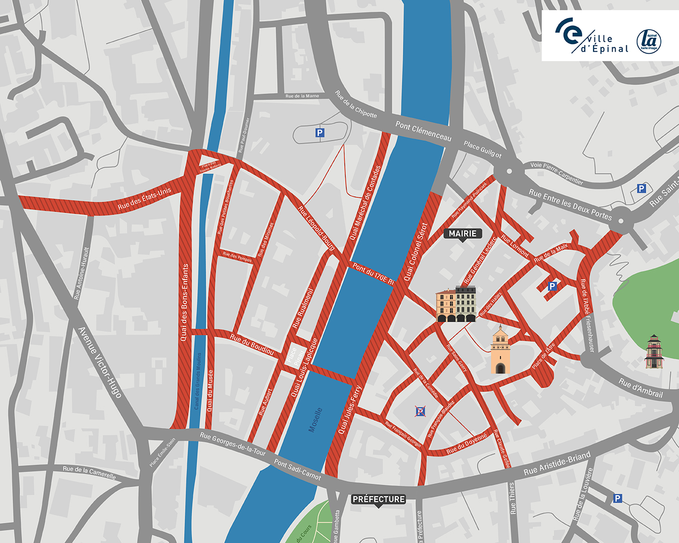 Les automobilistes sont invités à anticiper leurs déplacements et à stationner en dehors de la zone piétonne. Les parkings de la ville restent accessibles et leur localisation est consultable sur le site officiel de la mairie : www.epinal.fr.