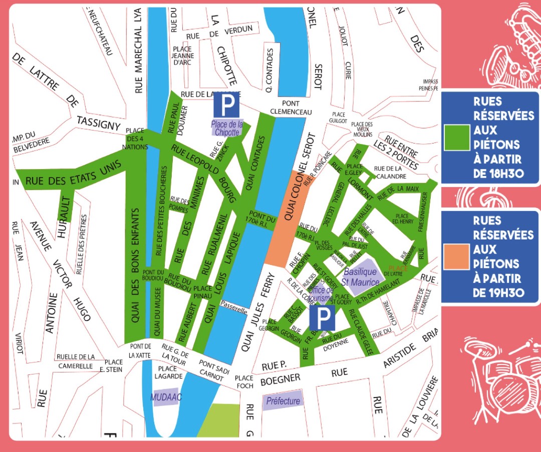 Tout au long de la soirée, les automobilistes pourront se garer sur les parkings de la ville, à retrouver sur le plan : www.epinal.fr/vivre-a-epinal/me-deplacer/en-voiture