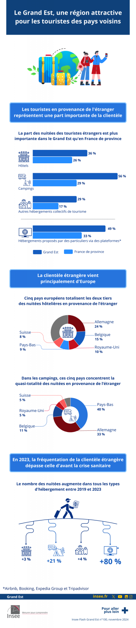 Le Grand Est se caractérise par une proportion de touristes en provenance de l’étranger supérieure à la moyenne, dans tous les types d’hébergements. Dans l’hôtellerie, les touristes non résidents privilégient les établissements de standing et les destinations alsaciennes. Ils viennent essentiellement d’Europe, surtout des pays voisins, Allemagne, Belgique et Suisse. Dans les campings, 84 % de la clientèle étrangère provient des Pays-Bas, d’Allemagne ou de Belgique. En 2023, les touristes étrangers sont de retour dans la région, plus nombreux qu’avant la crise sanitaire.