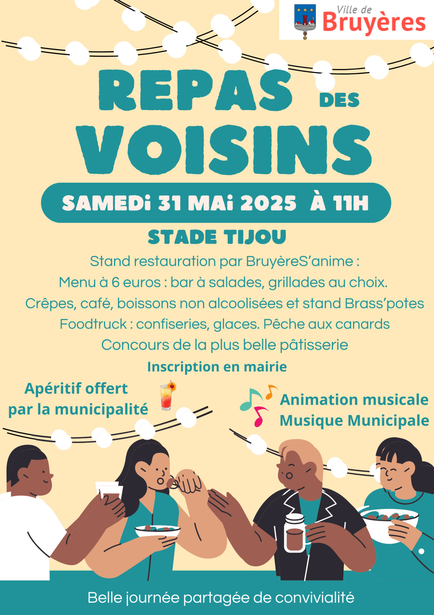 La Ville de Bruyères vous invite à partager un moment de convivialité et de bonne humeur à l’occasion du Repas des Voisins, qui se tiendra le samedi 31 mai 2025 à 11h au Stade Tijou.