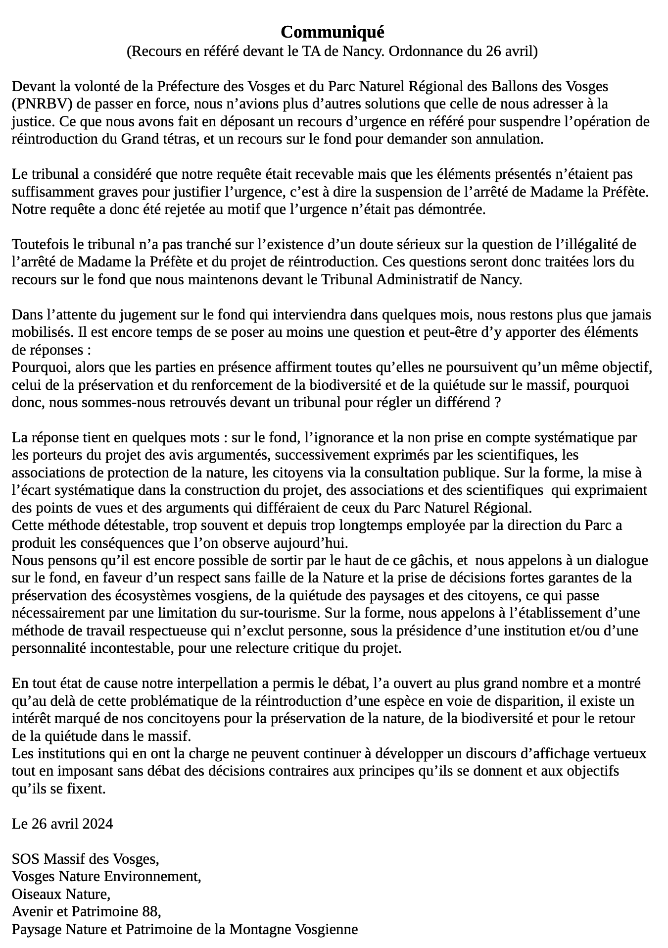 Grand tétras : réaction des associations suite au rejet du recours en justice Publié le Samedi 27 Avril 2024 Partager Facebook Twitter Linkedin Communiqué de presse des associations suite au rejet du recours en justice. Grand Tétras × Intégrer la vidéo Taille prédéfinie du lecteur S M L Taille personnalisée