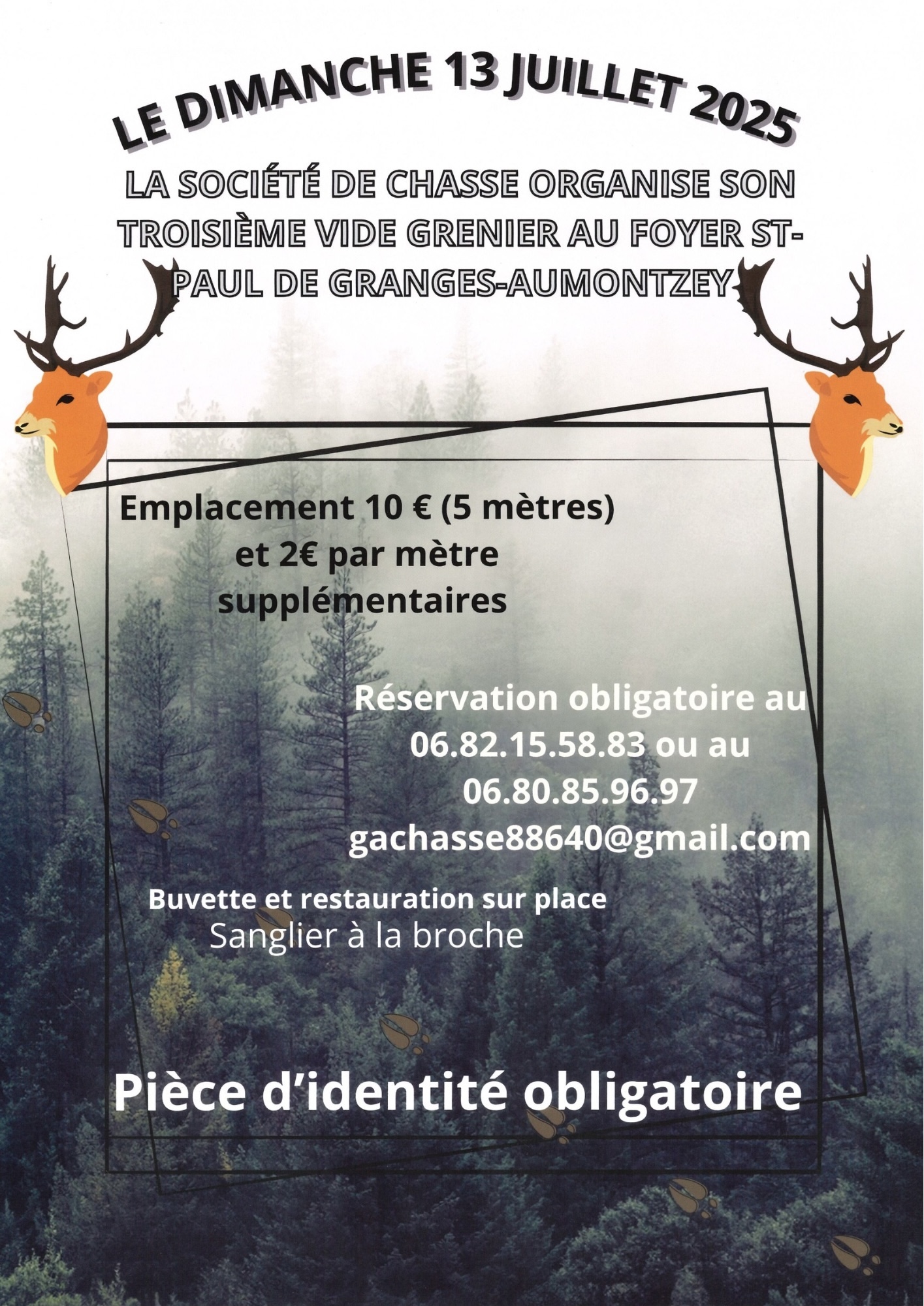 La société de Chasse de Granges-Aumontzey organise le dimanche 13 juillet 2025 au Foyer Saint Paul de Granges-Aumontzey son vide grenier !