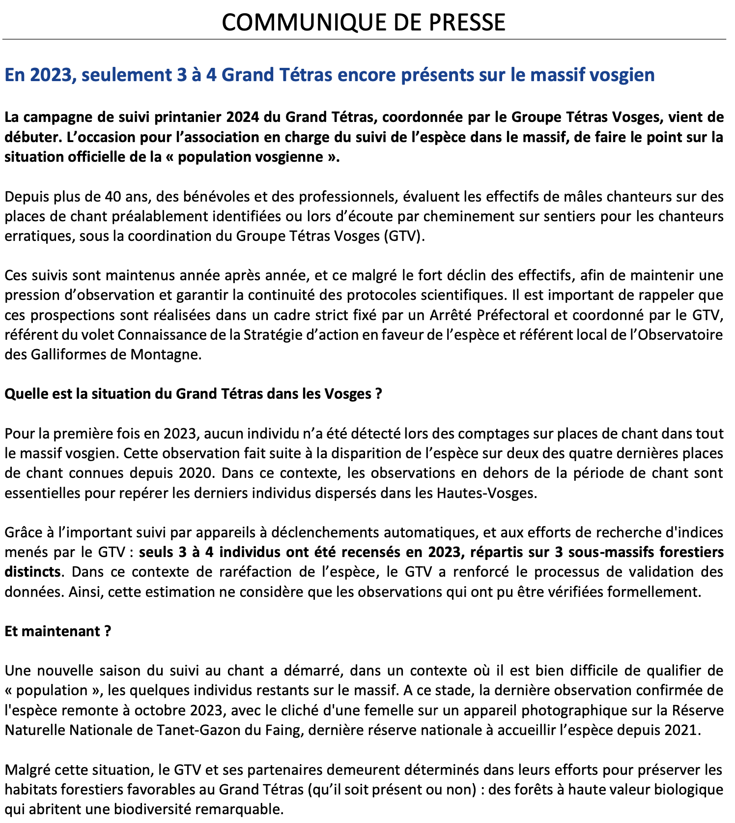 Alors que la préfecture doit valider ou non le plan de renforcement du Grand Tétras (une vingtaine d'individus capturés en Norvège pourraient être relâchés sur le Massif vosgien dès ce printemps), le groupe Grand tétras tient dans un communiqué à apporter les précisions suivantes :