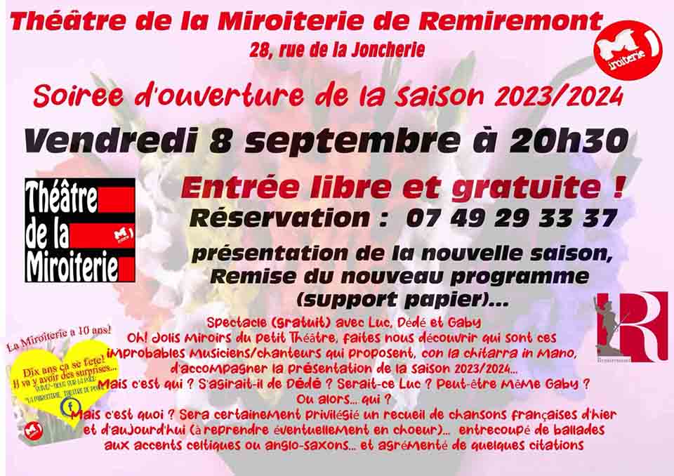 Soirée inaugurale de la saison culturelle 2023 / 2024 du Théâtre de Poche « La Miroiterie » le vendredi 8 septembre à 20h30 à Remiremont.