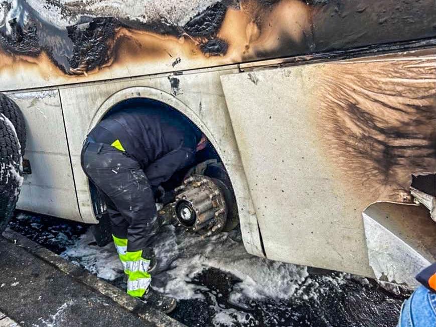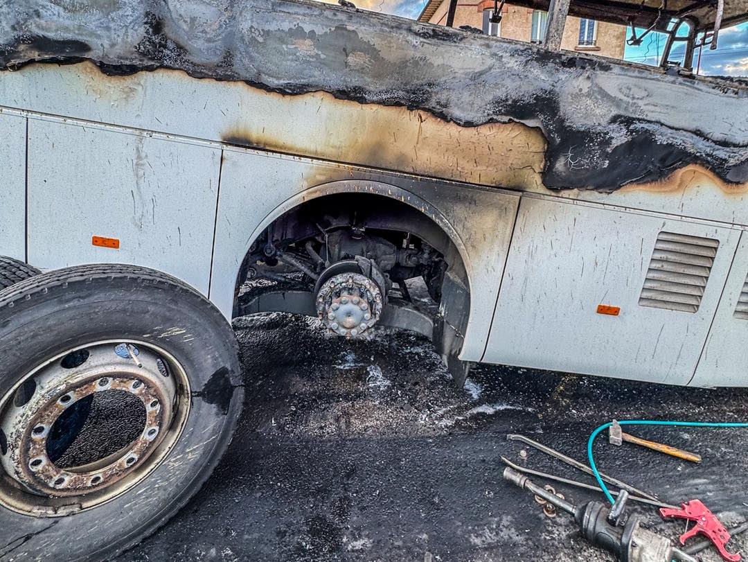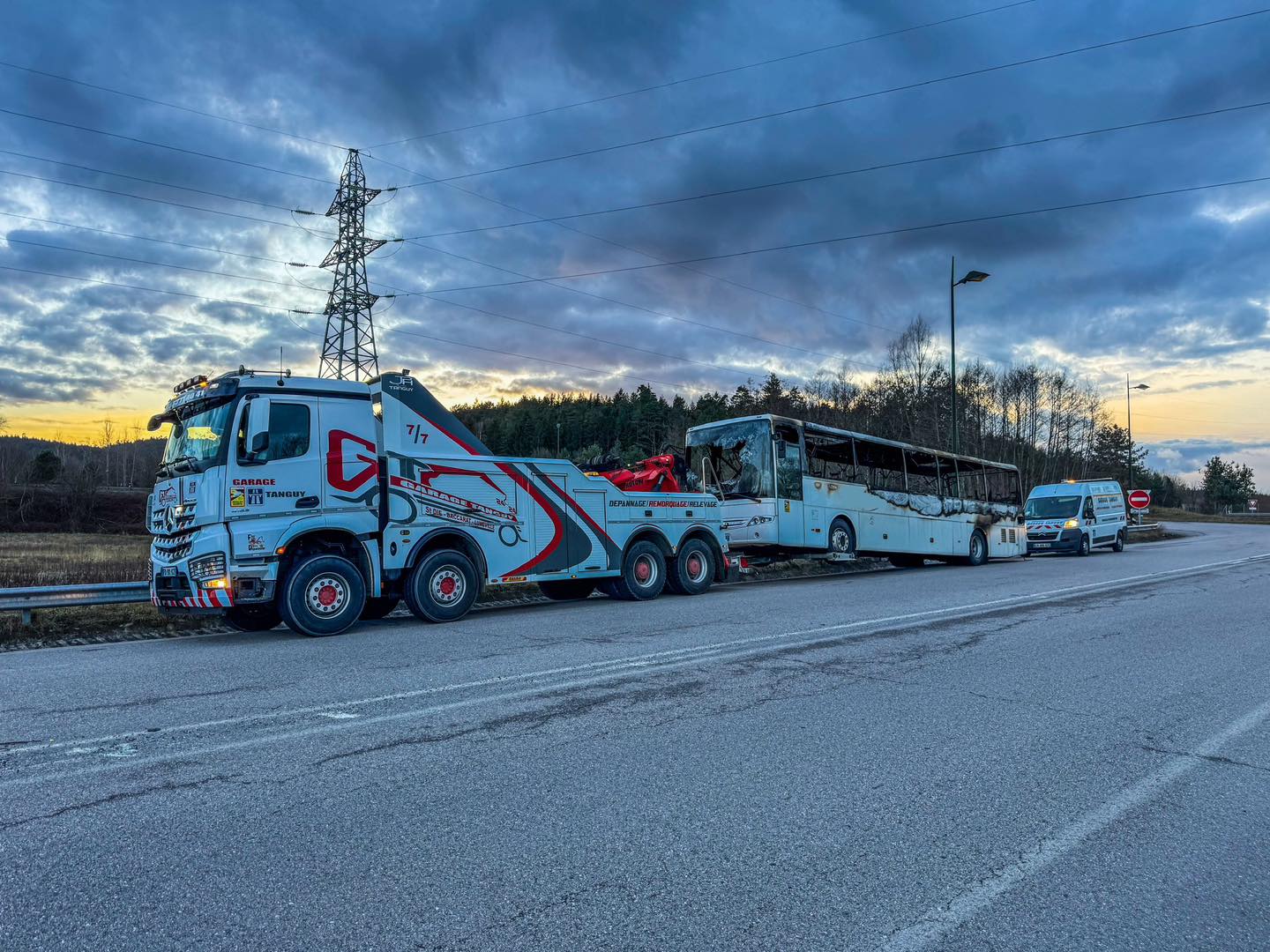 Mise à jour du 28/02/2025 : L'entreprise du GROUPE Tanguy a publié les photos du remorquage du bus incendié, aux lourds dégâts