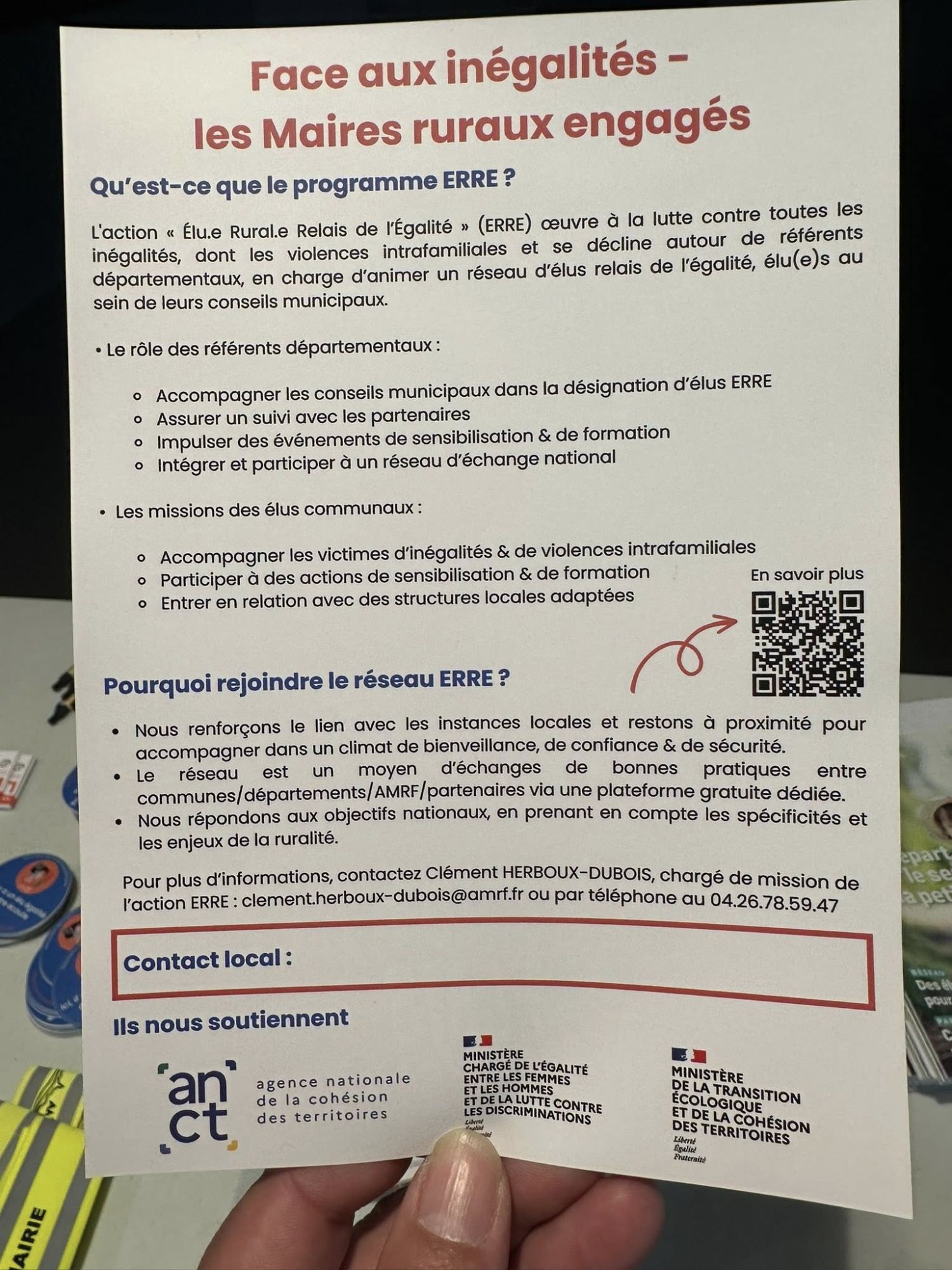 Le programme ERRE repose sur un principe simple : faire de la mairie un point d’écoute de proximité pour les victimes. Chaque commune volontaire est invitée à désigner un référent communal, formé pour orienter les personnes en détresse vers les professionnels compétents.