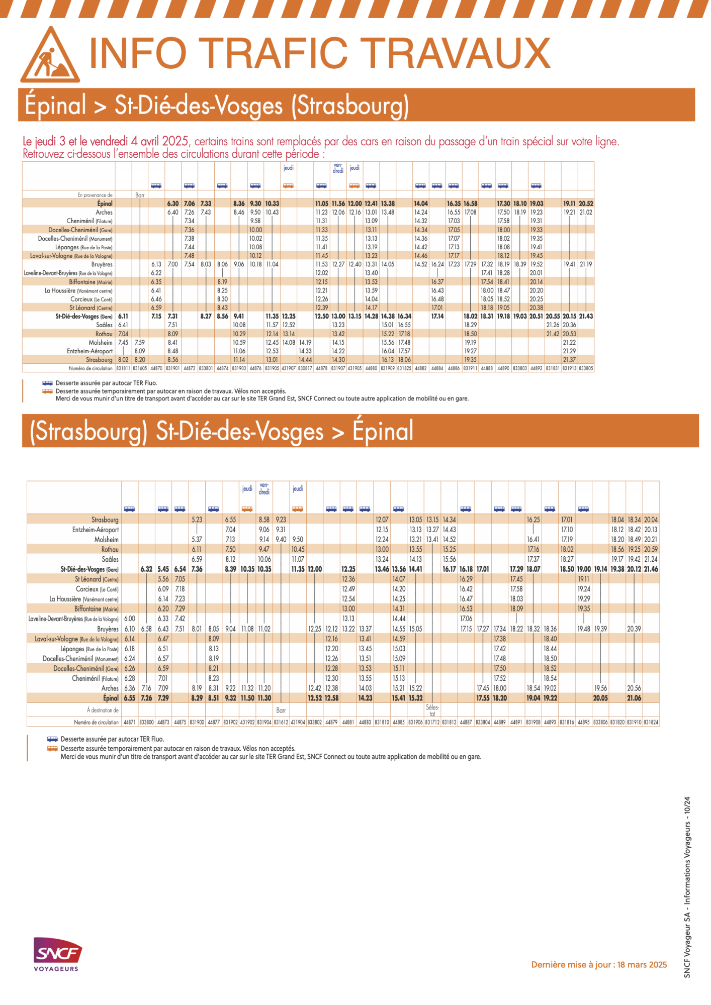 Les usagers de la ligne ferroviaire Épinal/Saint-Dié-des-Vosges/Strasbourg devront faire preuve de patience les jeudi 3 et vendredi 4 avril 2025. En raison du passage d’un train spécial, certains trains seront supprimés et remplacés par des cars de substitution.