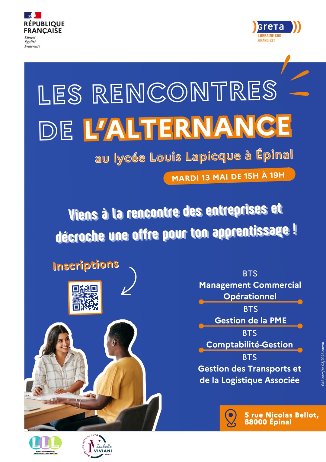 Les Rencontres de l’Alternance sont ouvertes à tous les jeunes en recherche d’orientation, étudiants salariés en reconversion. Cet événement a pour objectif de favoriser les échanges entre les candidats et les entreprises qui cherchent des apprentis, tout en mettant en lumière les formations en BTS en alternance proposées par le GRETA- CFA Lorraine Sud qui sont dispensées aux lycées Louis Lapicque et Isabelle Viviani d’Épinal.