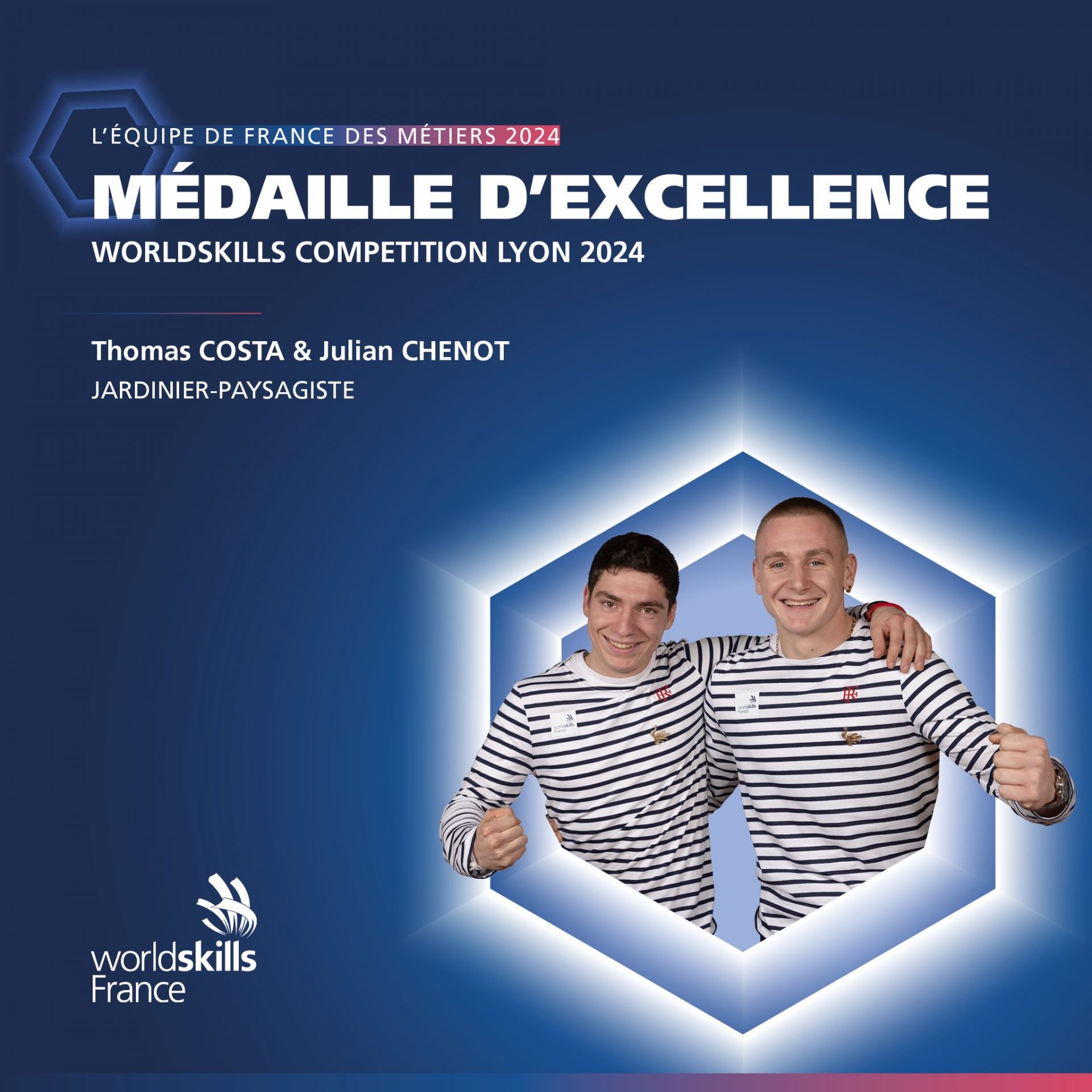 Le binôme Thomas Costa et Julian Chenot remportent la médaille d'excellence pour le métier Jardinier-Paysagiste à la compétition Mondiale des Métiers WorldSkills Lyon 2024 qui a eu lieu du 11 au 15 septembre.