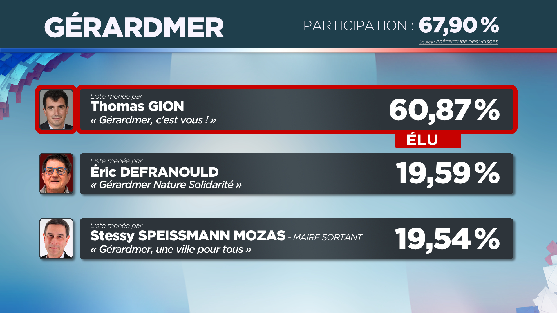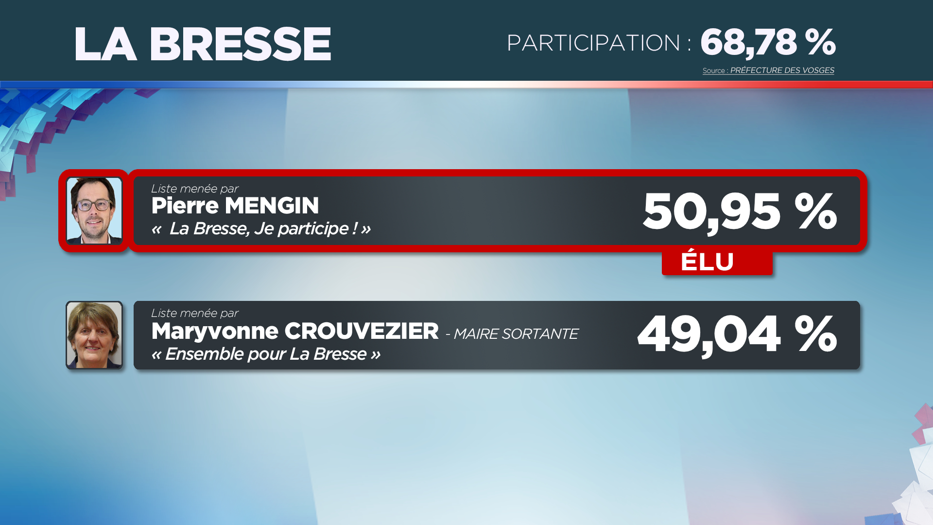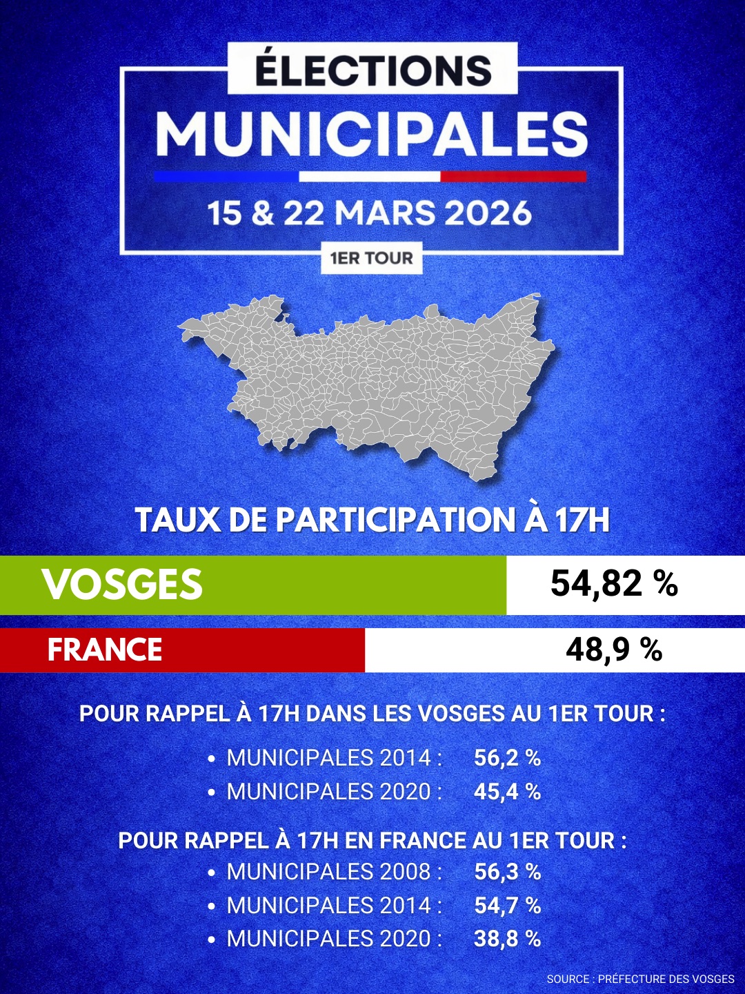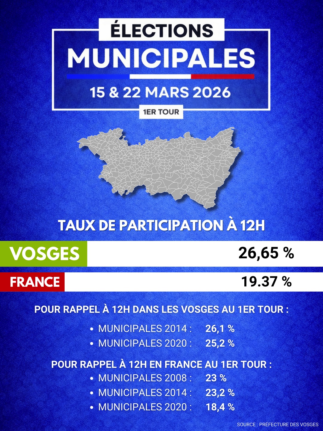 Retrouvez dès 20H une carte des Vosges actualisée tout au long de la soirée pour suivre en un coup d’œil les communes où un maire sera élu dès le premier tour, celles où un second tour sera nécessaire, ainsi que les grandes tendances du scrutin dans le département.