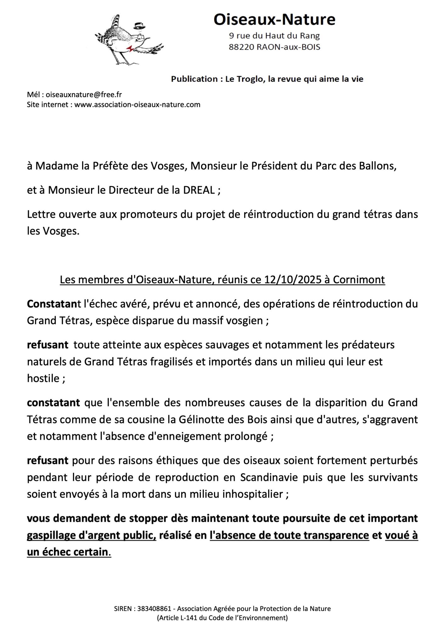 La journée s’est poursuivie avec la validation d’une motion intitulée « Tétras », qui sera adressée aux autorités. Ce texte, véritable lettre ouverte, demande l’arrêt du projet de réintroduction du grand tétras dans les Vosges.