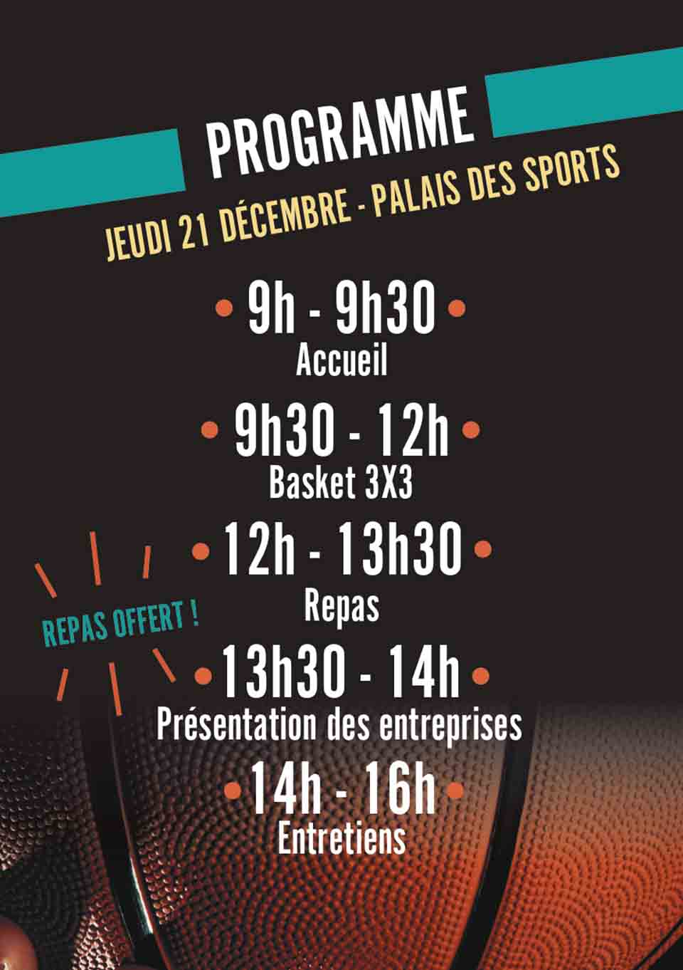 Cette journée débutera par un temps d’accueil, puis un tournoi de basket 3×3. Suivra un repas offert par la ville, puis une présentation des entreprises partenaires. Enfin, un job dating proposera aux demandeurs d’emploi de rencontrer recruteurs et représentants des entreprises partenaires, pour des entretiens d’embauche.